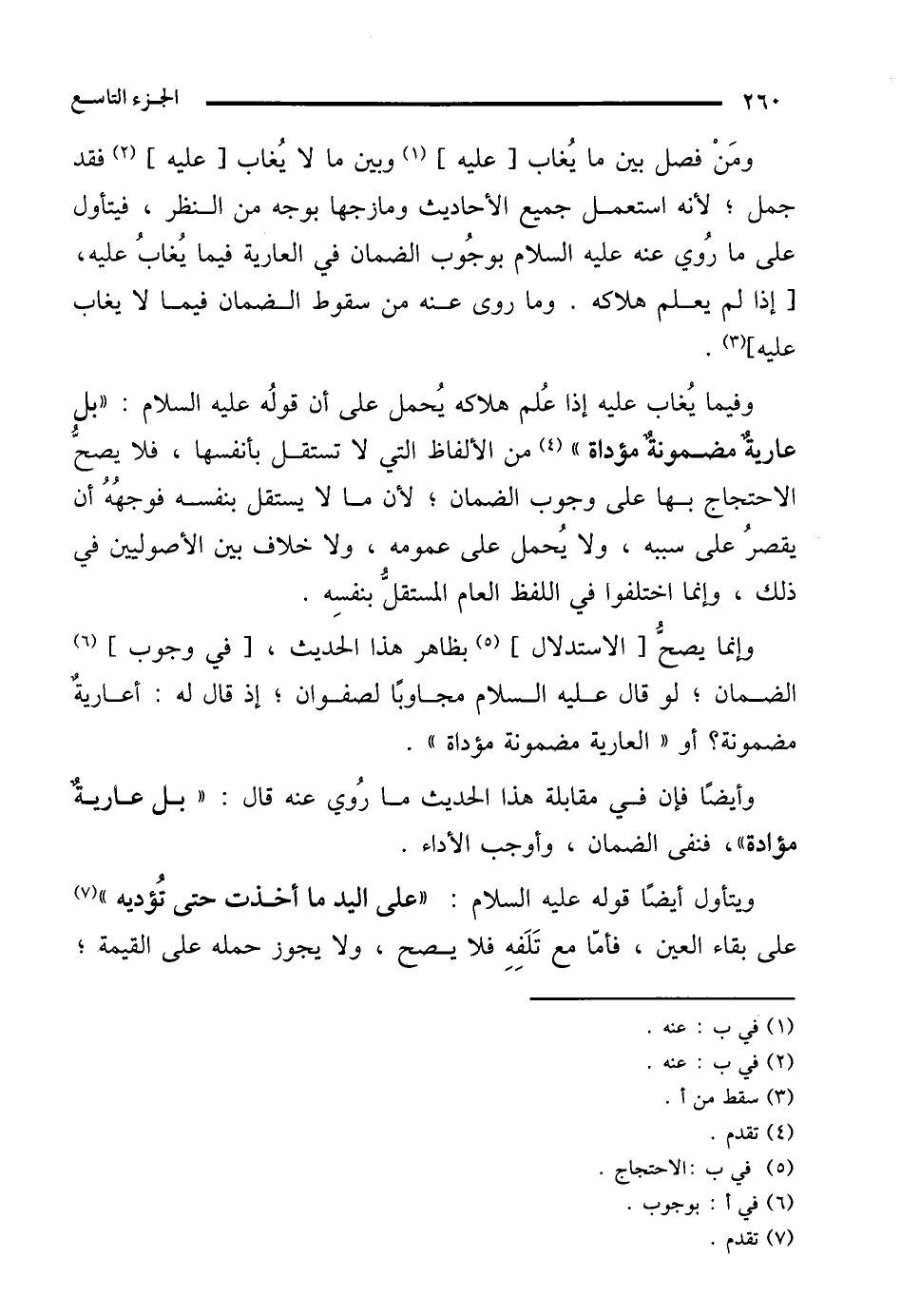 وفيما يُغاب عليه إذا عُلم هلاكه يُحمل على أن قولُه عليه السلام: "بل عاريةٌ مضمونةٌ مؤداة" (¬4) من الألفاظ التي لا تستقل بأنفسها، فلا يصحُّ الاحتجاج بها على وجوب الضمان؛ لأن ما لا يستقل بنفسه فوجهُهُ أن يقصرُ على سببه، ولا يُحمل على عمومه، ولا خلاف بين الأصوليين في ذلك، وإنما اختلفوا في اللفظ العام المستقلُّ بنفسِه.
