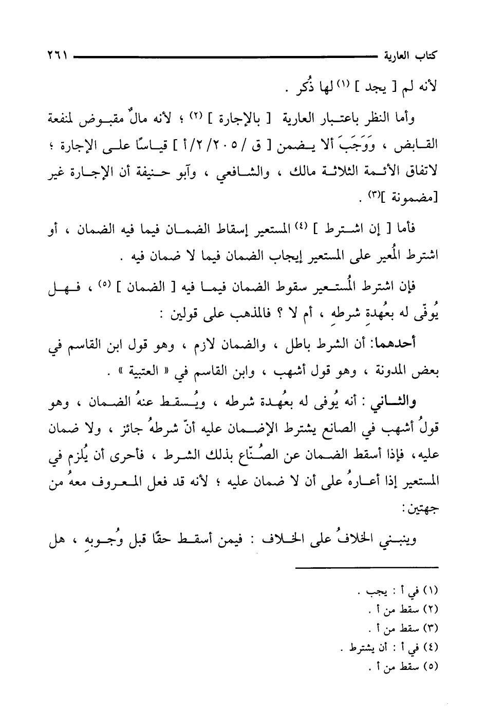 والثاني: أنه يُوفى له بعُهدة شرطه، ويُسقط عنهُ الضمان، وهو قولُ أشهب في الصانع يشترط الإضمان عليه أنّ شرطهُ جائز، ولا ضمان عليه، فإذا أسقط الضمان عن الصُنّاع بذلك الشرط، فأحرى أن يُلزم في المستعير إذا أعارهُ على أن لا ضمان عليه؛ لأنه قد فعل المعروف معهُ من جهتين: