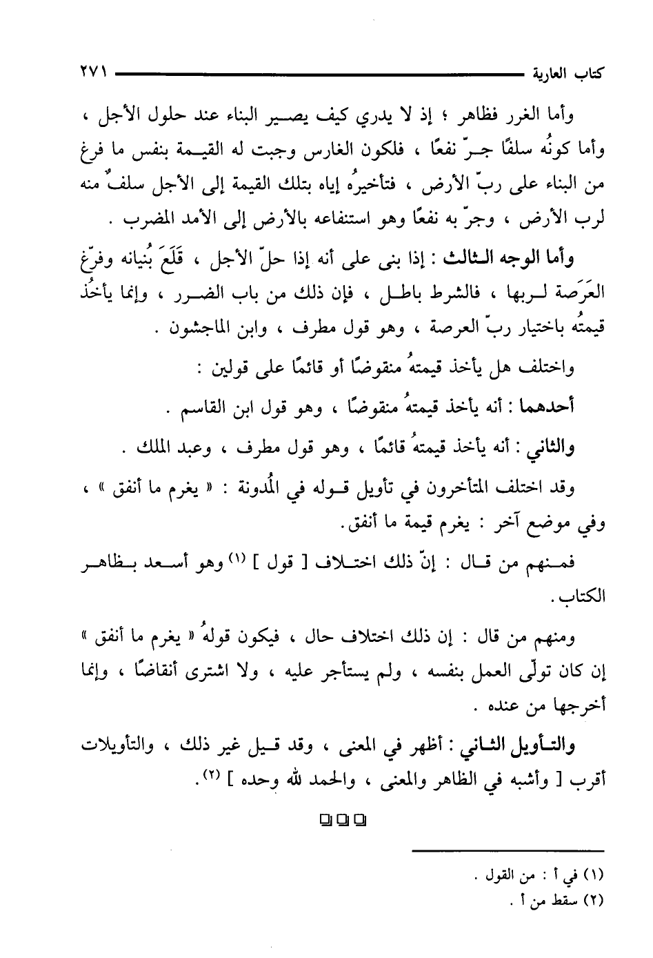 وأما الغرر فظاهر؛ إذ لا يدري كيف يصير البناء عند حلول الأجل، وأما كونُه سلفًا جرّ نفعًا، فلكون الغارس وجبت له القيمة بنفس ما فرغ من البناء على ربّ الأرض، فتأخيرُه إياه بتلك القيمة إلى الأجل سلفٌ منه لرب الأرض، وجرّ به نفعًا وهو استنفاعه بالأرض إلى الأمد المضرب.