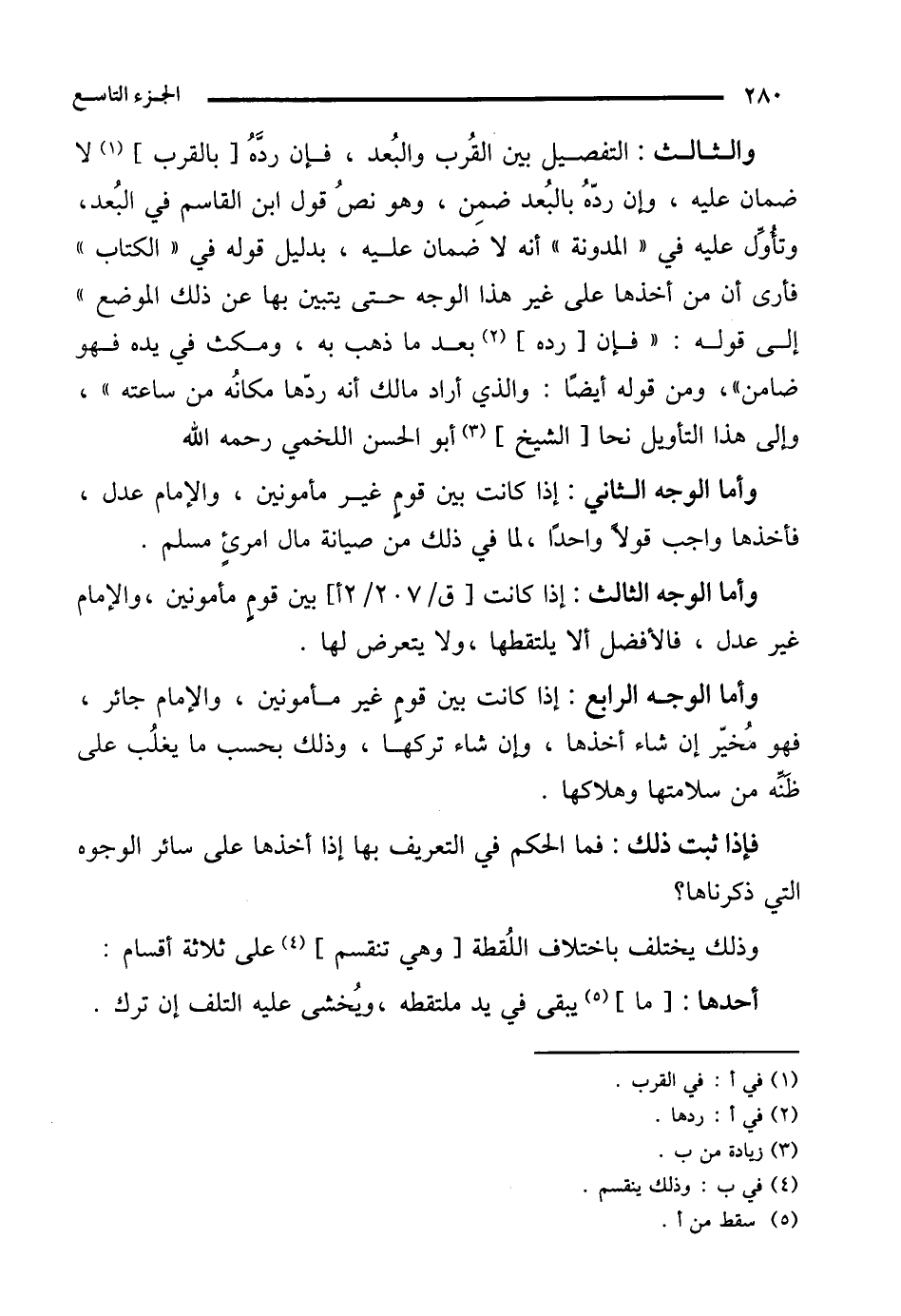 والثالث: التفصيل بين القُرب والبُعد، فإن ردَّهُ [بالقرب] (¬1) لا ضمان عليه، وإن ردّهُ بالبُعد ضمِن، وهو نصُ قول ابن القاسم في البُعد، وتأوّل عليه في "المدونة" أنه لا ضمان عليه، بدليل قوله في "الكتاب" فأرى أن من أخذها على غير هذا الوجه حتى يتبين بها عن ذلك الموضع إلى قوله: "فإن [رده] (¬2) بعدما ذهب به، ومكث في يده فهو ضامن"، ومن قوله أيضًا: "والذي أراد مالك أنه ردّها مكانُه من ساعته"، وإلى هذا التأويل نحا [الشيخ] (¬3) أبو الحسن اللخمي رحمه الله.