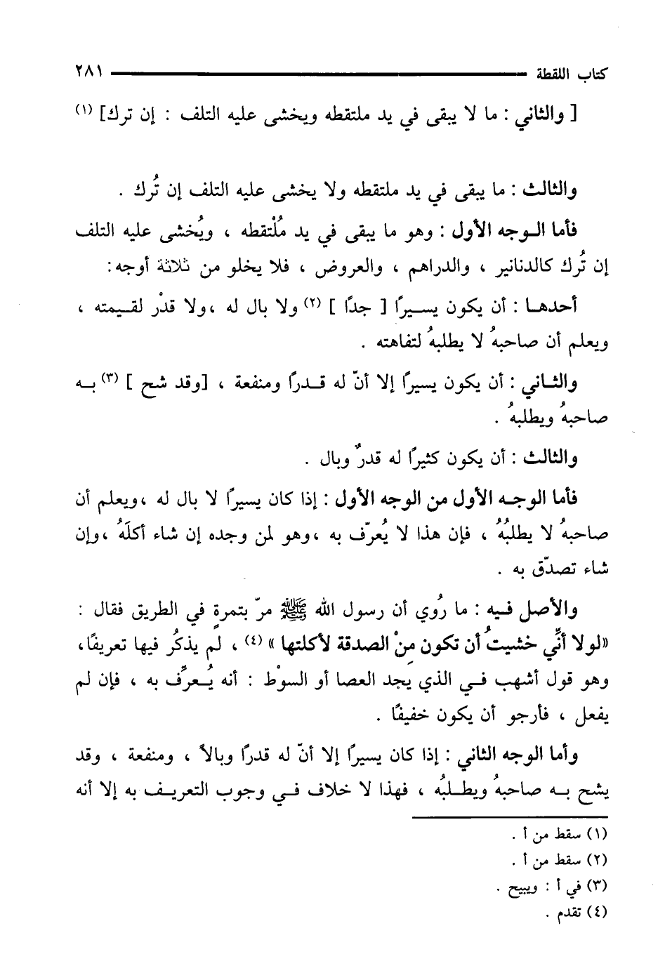 وأما الوجه الثاني: إذا كان يسيرًا إلا أنّ له قدرًا وبالًا، ومنفعة، وقد يشح به صاحبهُ ويطلبُه، فهذا لا خلاف في وجوب التعريف به إلا أنه