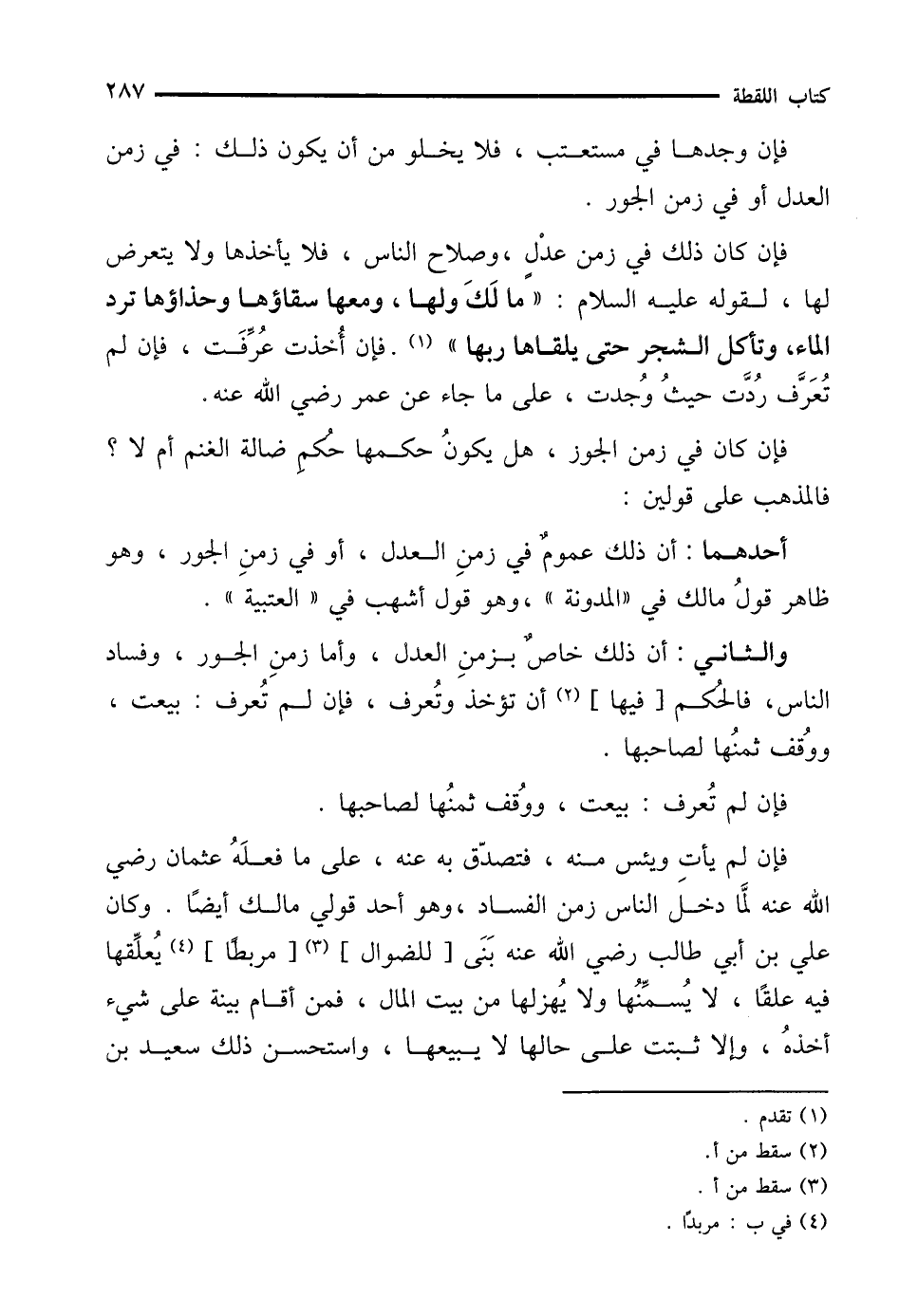 والثاني: أن ذلك خاصٌ بزمنِ العدل، وأما زمنِ الجور، وفساد الناس، فالحُكم [فيها] (¬2) أن تؤخذ وتُعرف، فإن لم تُعرف: بيعت، ووُقف ثمنُها لصاحبها.