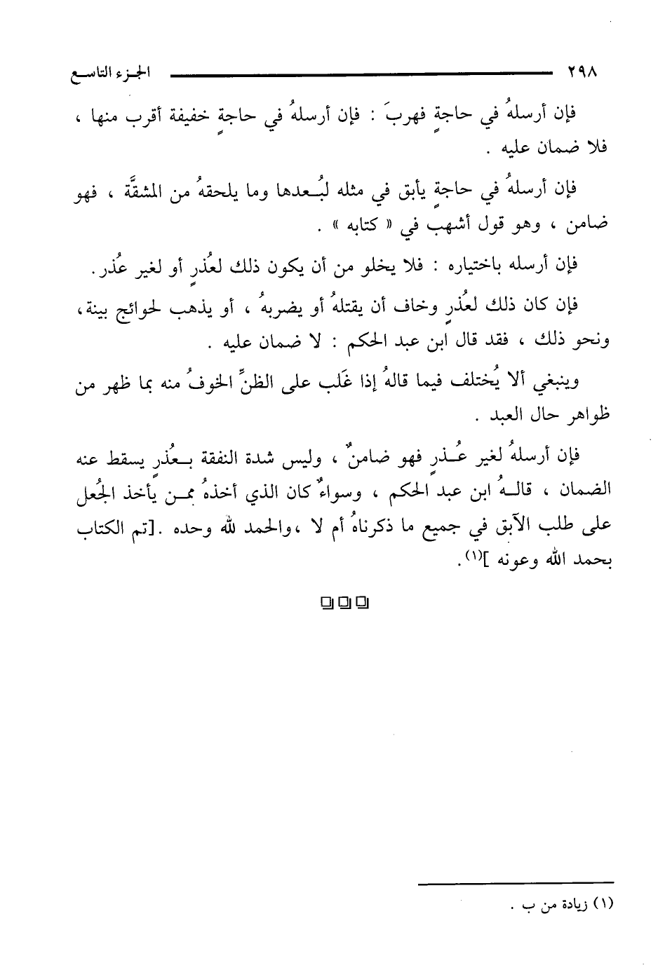 فإن أرسلهُ لغير عُذرٍ فهو ضامن، وليس شدة النفقة بعُذرٍ يسقط عنه الضمان، قالهُ ابن عبد الحكم، وسواء كان الذي أخذهُ ممن يأخذ الجُعل على طلب الآبق في جميع ما ذكرناهُ أم لا، والحمد لله وحده. [تم الكتاب بحمد الله وعونه] (¬1).