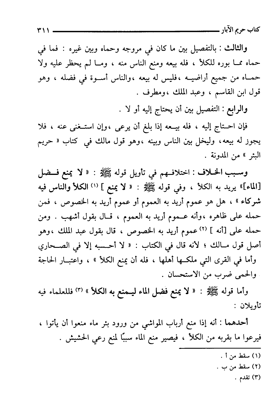 وسبب الخلاف: اختلافهم في تأويل قوله - صلى الله عليه وسلم -: "لا يمنع فضل [الماء] " يريد به الكلأ، وفي قوله - صلى الله عليه وسلم -: "لا يمنع] (¬1) الكلأ والناس فيه شركاء"، هل هو عموم أريد به العموم أو عموم أريد به الخصوص، فمن حمله على ظاهره، وأنه عموم أريد به العموم، قال بقول أشهب. ومن حمله على [أنه] (¬2) عموم أريد به الخصوص، قال بقول عبد الملك، وهو أصل قول مالك؛ لأنه قال في الكتاب: "لا أحسبه إلا في الصحاري وأما في القرى التي ملكها أهلها، فله أن يمنع الكلأ"، واعتبار الحاجة والحمى ضرب من الاستحسان.