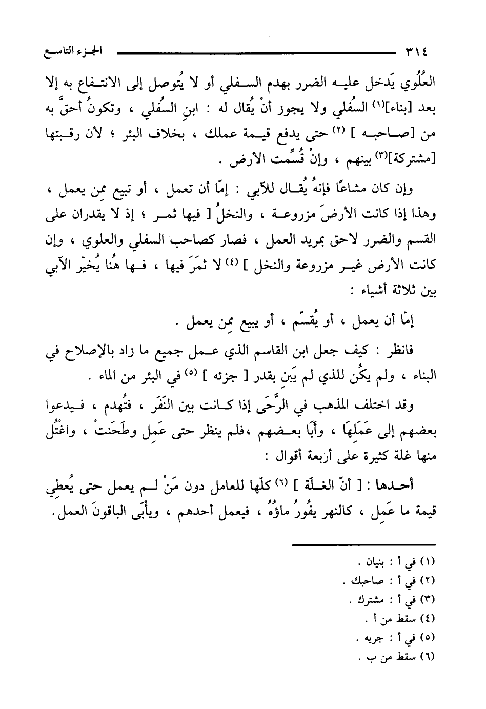 وقد اختلف المذهب في الرَّحَى إذا كانت بين النَفَر، فتُهدم، فيدعوا بعضهم إلى عَمَلِهَا، وأَبَا بعضهم، فلم ينظر حتى عَمِل وطَحَنتْ، واغْتُل منها غلة كثيرة على أربعة أقوال: