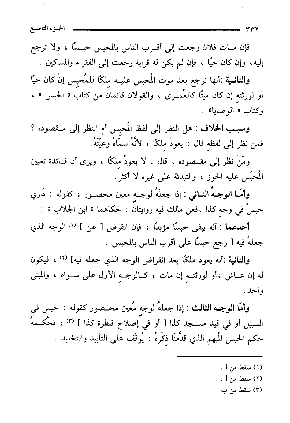 وسبب الخلاف: هل النظر إلى لفظ المُحبس أم النظر إلى مقصوده؟ فمن نظر إلى لفظهِ قال: يعودُ مِلكًا؛ لأنَّهُ سمَّاهُ وعيّنَهُ.