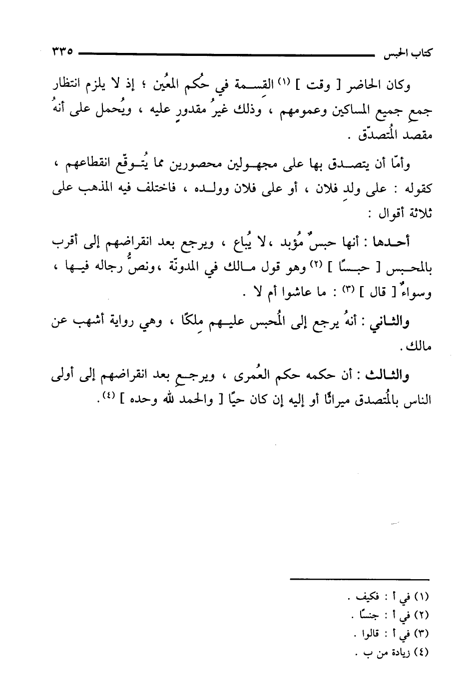 أحدها: أنها حبسٌ مُؤبد، لا يُباع، ويرجع بعد انقراضهم إلى أقرب بالمحبس [حبسًا] (¬2) وهو قول مالك في المدونّة، ونصُّ رجاله فيها، وسواءٌ [قال] (¬3): ما عاشوا أم لا.