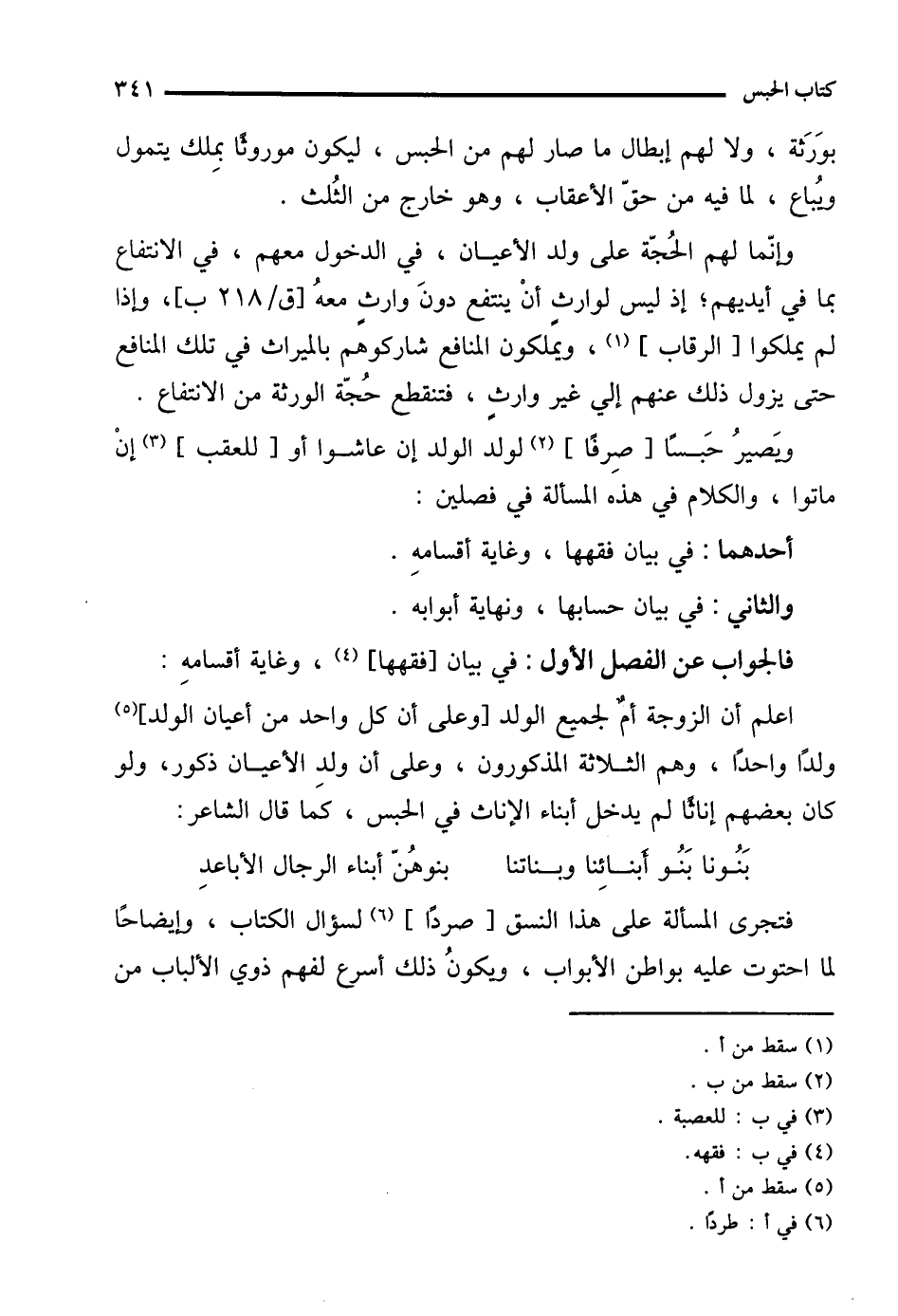 اعلم أن الزوجة أمٌ لجميع الولد [وعلى أن كل واحد من أعيان الولد] (¬5) ولدًا واحدًا، وهم الثلاثة المذكورون، وعلى أن ولدِ الأعيان ذكور، ولو كان بعضهم إناثًا لم يدخل أبناء الإناث في الحبس، كما قال الشاعر: