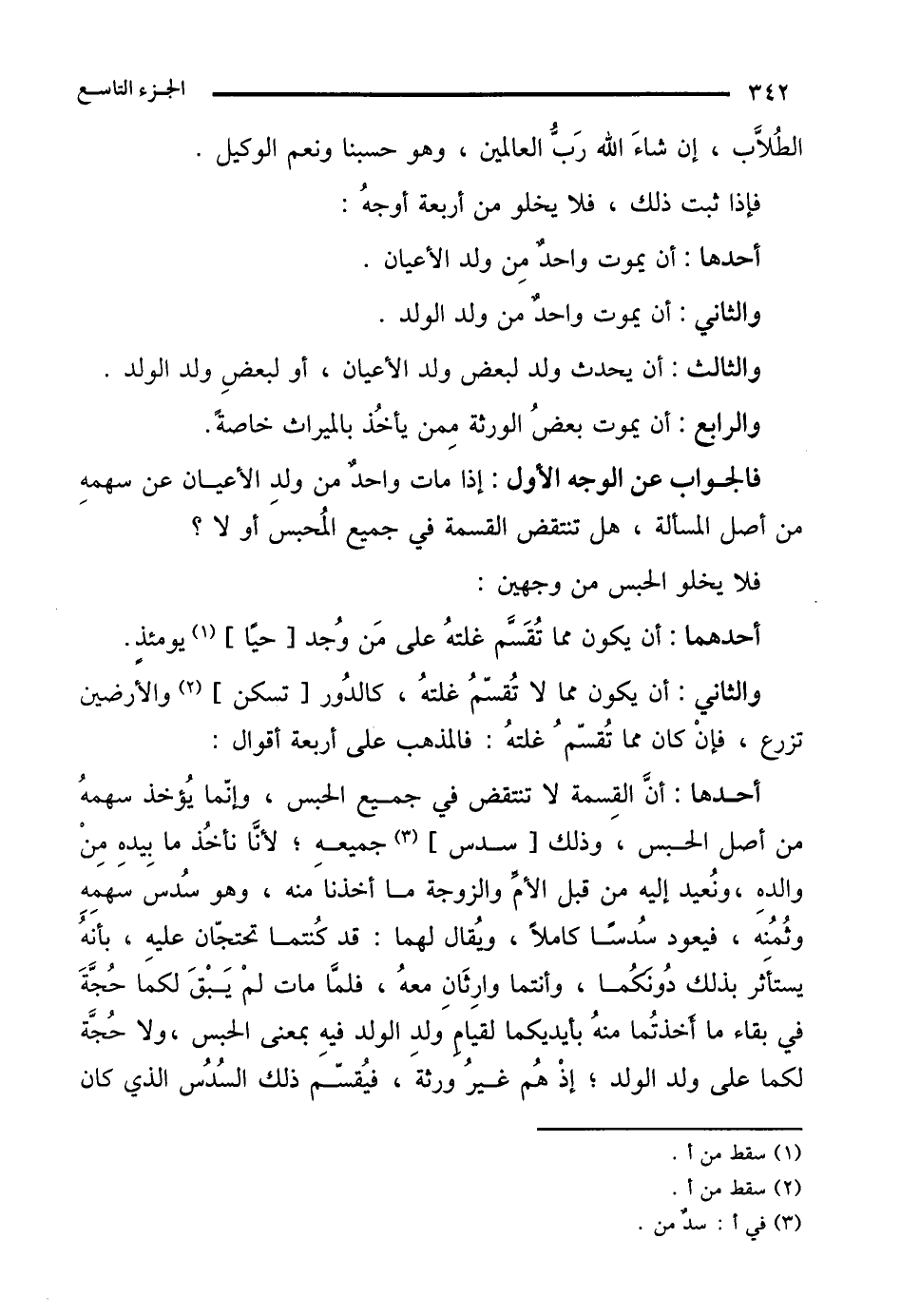 أحدها: أنَّ القِسمة لا تنتقض في جميع الحبس، وإنّما يُؤخذ سهمهُ من أصل الحبس، وذلك [سدس] (¬3) جميعهِ؛ لأنَّا نأخُذ ما بِيدهِ مِنْ والدهِ، ونُعيد إليه من قبل الأم والزوجة ما أخذنا منه، وهو سُدس سهمهِ وثُمُنه، فيعود سُدسًا كاملًا، ويُقال لهما: قد كُنتما تحتجّان عليه, بأنهُ يستأثر بذلك دُونَكُما، وأنتما وارِثَان معهُ، فلما مات لمْ يَبْقَ لكمَا حُجَّةَ في بقاء ما أخذتُما منهُ بأيديكما لقيامِ ولدِ الولد فيهِ بمعنى الحبس، ولا حُجَّة لكما على ولد الولد؛ إذْ هُم غيرُ ورثة، فيُقسم ذلك السُدُس الذي كان