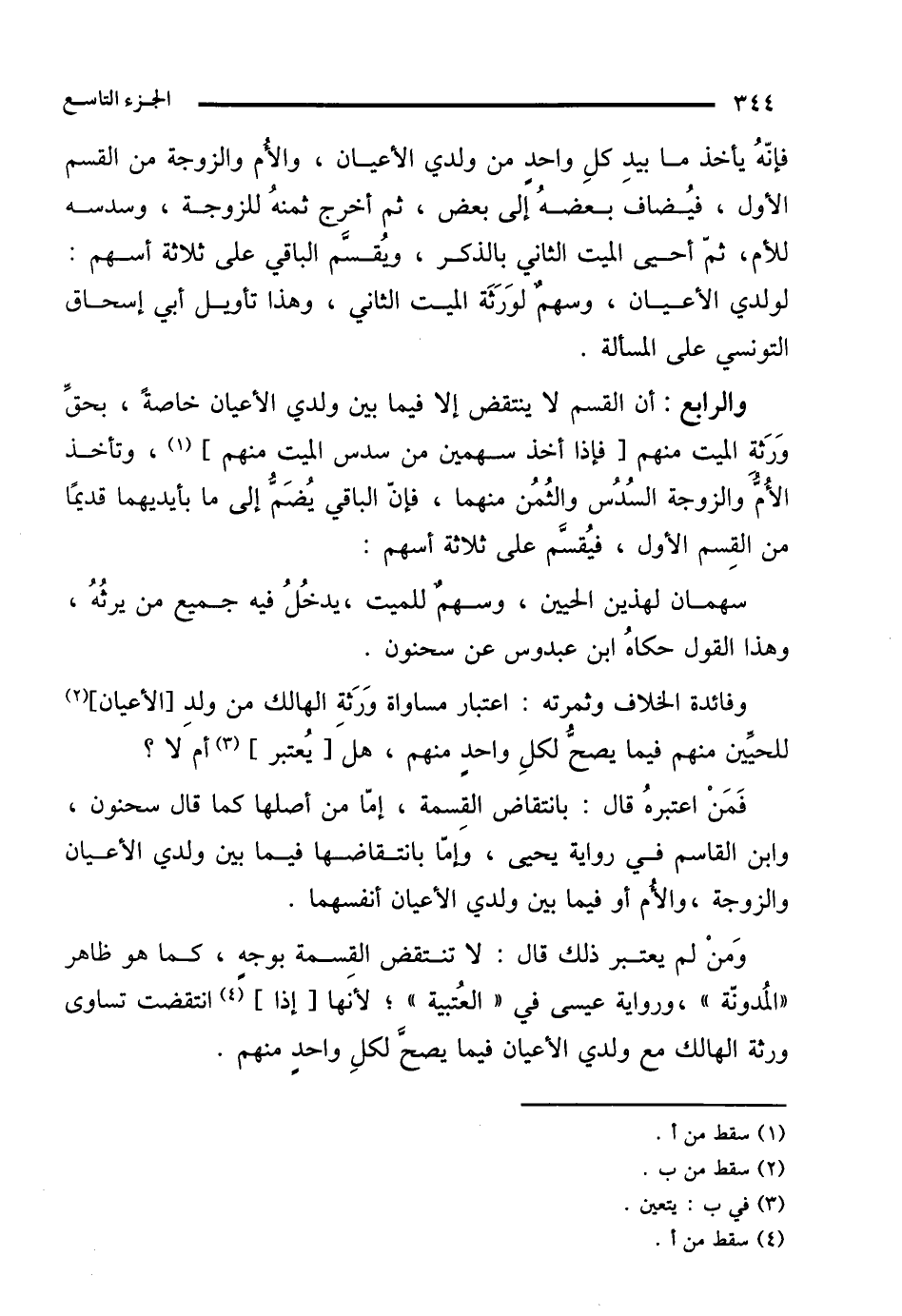 فَمَنْ اعتبرهُ قال: بانتقاض القِسمة، إمّا من أصلها كما قال سحنون، وابن القاسم في رواية يحيى، وإمّا بانتقاضها فيما بين ولدي الأعيان والزوجة، والأُم أو فيما بين ولدي الأعيان أنفسهما.