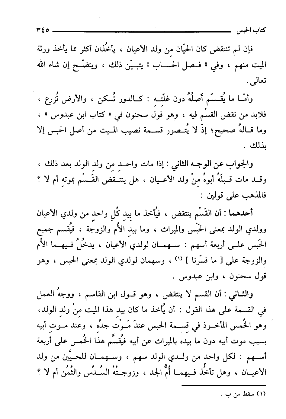 فإن لم تنتقض كان الحيّان مِن ولد الأعيان، يأخُذان أكثر مما يأخذ ورثة الميت منهم، وفي "فصل الحساب" يتبيّن ذلك، ويتضّح إن شاء الله تعالى.