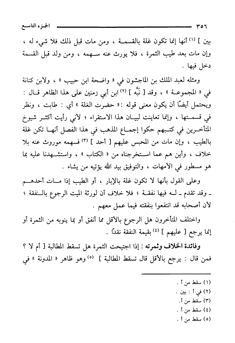 ومثله لعبد الملك بن الماجشون في "واضحة ابن حبيب"، ولابن كنانة في "المجموعة"، وقد [نَبَّه] (¬2) ابن أبي زمنين على هذا الظاهر قال: ويحتمل أيضًا أن يكون معنى قوله: "حضرت الغلة" أي: طابت، ونظر في قسمتها، وإنما تعاينت لبيان هذا الاستقراء؛ لأني رأيت أكثر شيوخ المتأخرين في كتبهم حكوا إجماع المذهب في هذا الفصل أنها تكون غلة بالطيب، وإن مات من المحبس عليهم [أحد] (¬3) فسهمه موروث عنه بلا خلاف، وأين هم عما استخرجناه من "الكتاب"، واستشهدنا عليه بما هو مسطور في الأمهات، والتوفيق بيد الله يؤتيه من يشاء.