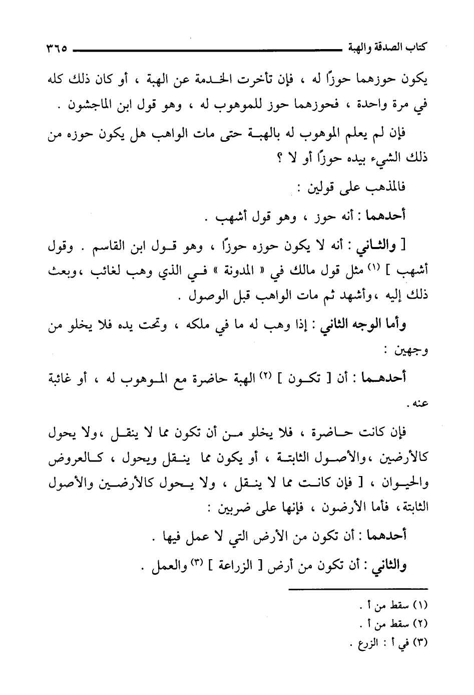 فإن كانت حاضرة، فلا يخلو من أن تكون مما لا ينقل، ولا يحول كالأرضين، والأصول الثابتة، أو يكون مما ينقل ويحول، كالعروض والحيوان، [فإن كانت مما لا ينقل، ولا يحول كالأرضين والأصول الثابتة، فأما الأرضون، فإنها على ضربين: