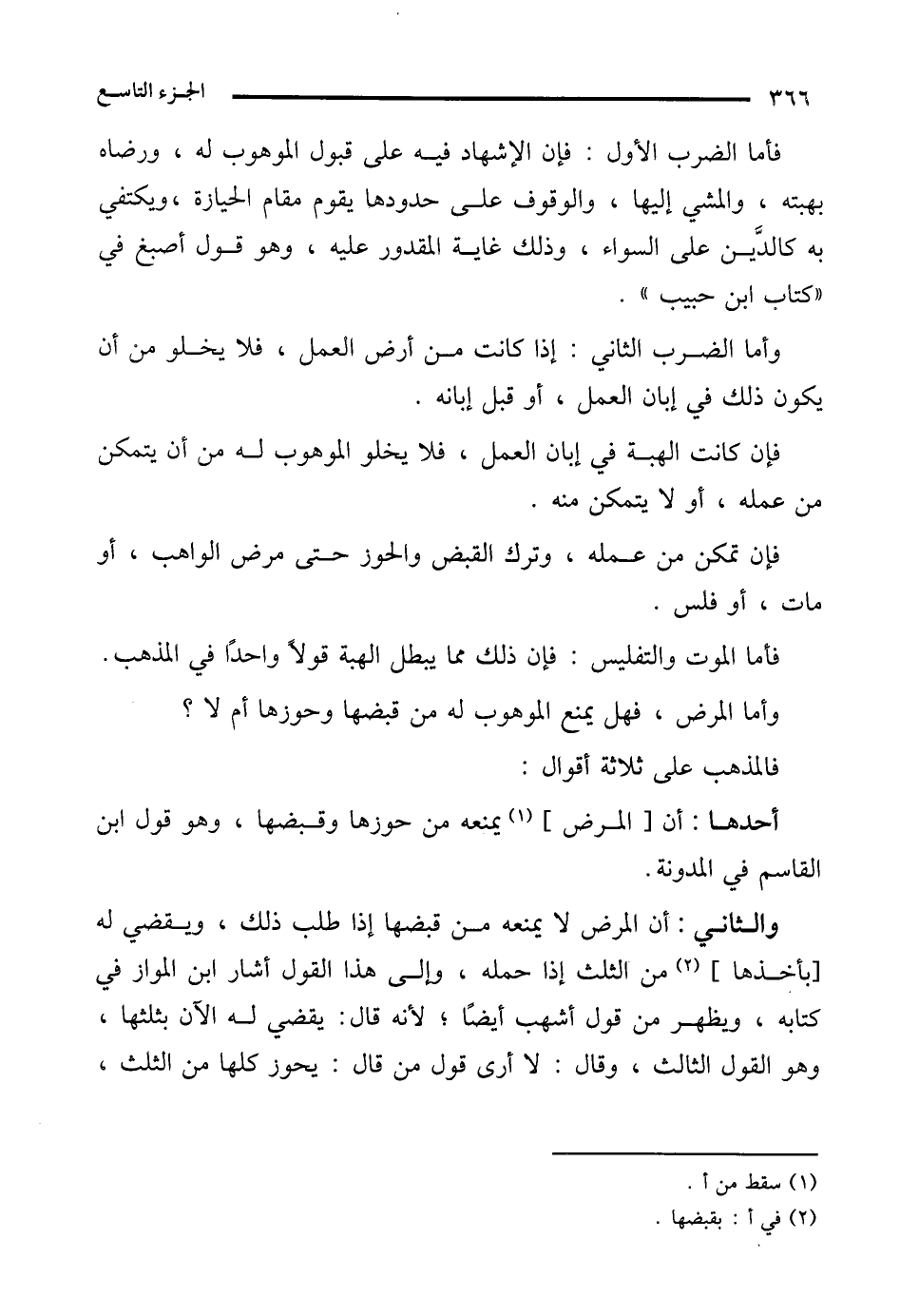والثاني: أن المرض لا يمنعه من قبضها إذا طلب ذلك، ويقضي له [بأخذها] (¬2) من الثلث إذا حمله، وإلى هذا القول أشار ابن المواز في كتابه، ويظهر من قول أشهب أيضًا؛ لأنه قال: يقضي له الآن بثلثها، وهو القول الثالث، وقال: لا أرى قول من قال: يحوز كلها من الثلث,