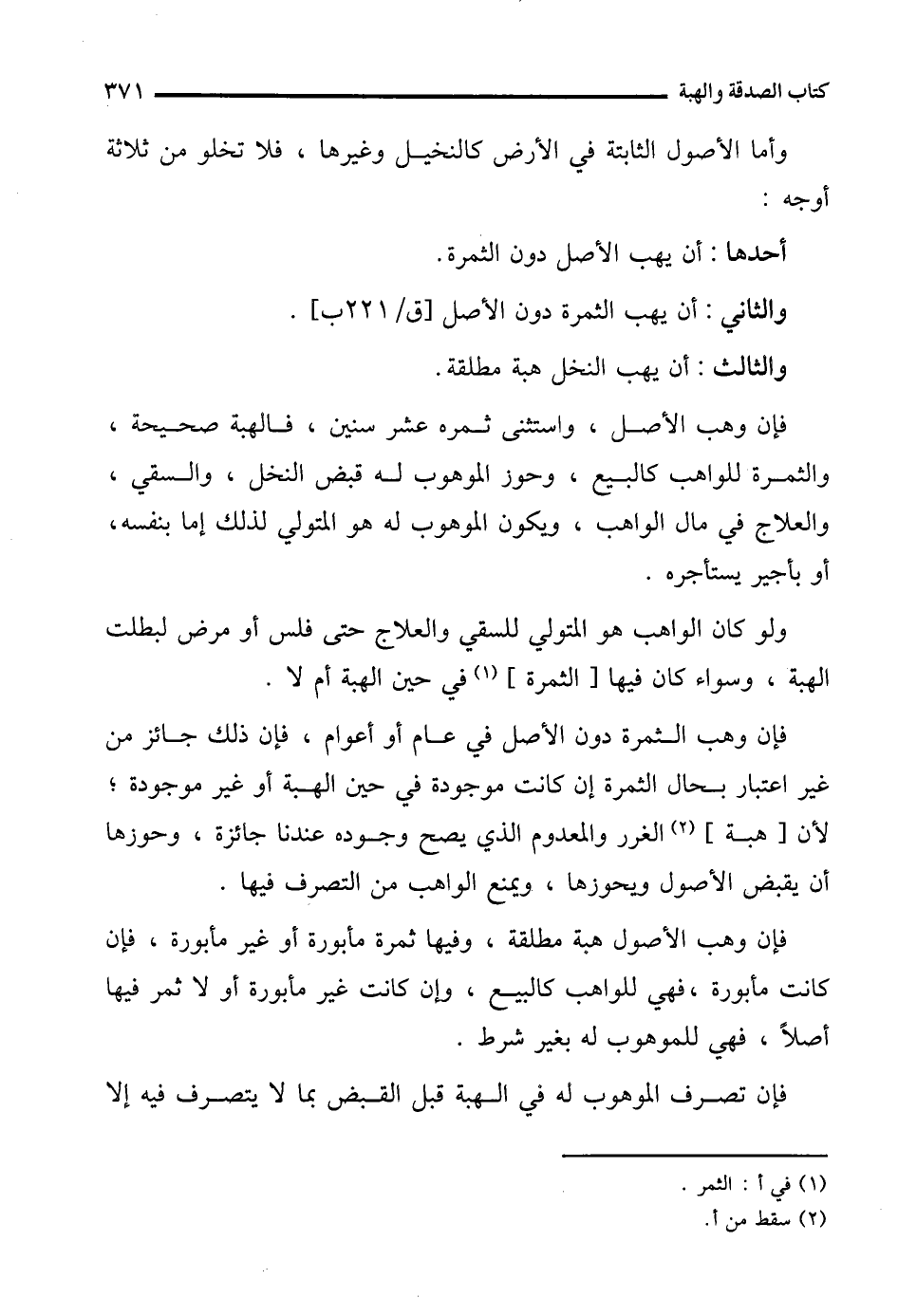 وأما الأصول الثابتة في الأرض كالنخيل وغيرها، فلا تخلو من ثلاثة أوجه: