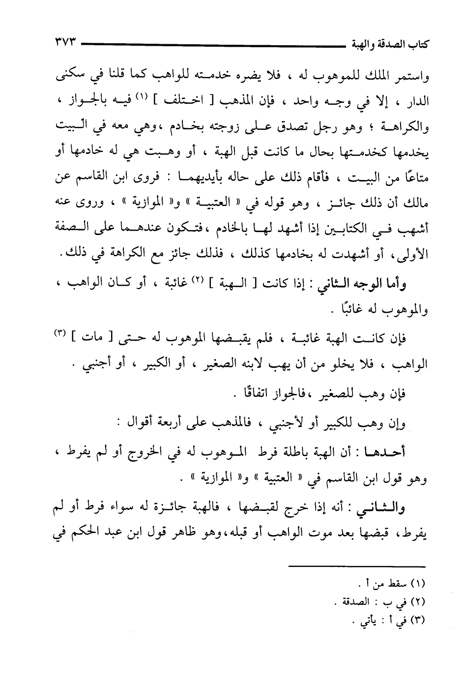 واستمر الملك للموهوب له، فلا يضره خدمته للواهب كما قلنا في سكنى الدار، إلا في وجه واحد، فإن المذهب [اختلف] (¬1) فيه بالجواز، والكراهة؛ وهو رجل تصدق على زوجته بخادم، وهي معه في البيت يخدمها كخدمتها لحال ما كانت قبل الهبة، أو وهبت هي له خادمها أو متاعًا من البيت، فأقام ذلك على حاله بأيديهما: فروى ابن القاسم عن مالك أن ذلك جائز، وهو قوله في "العتبية" و"الموازية"، وروى عنه أشهب في الكتابين إذا أشهد لها بالخادم، فتكون عندهما على الصفة الأولى، أو أشهدت له بخادمها كذلك، فذلك جائز مع الكراهة في ذلك.