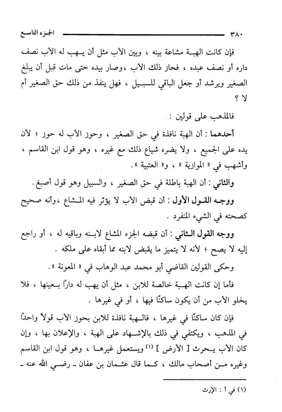 ووجه القول الثاني: أن قبضه الجزء المشاع لابنه وباقيه له، أو راجع إليه لا يصح؛ لأنه لا يتميز ما يقبض لابنه مما أبقاه على ملكه.