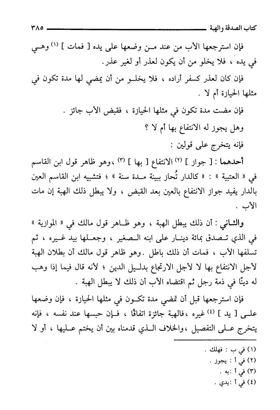 والثاني: أن ذلك يبطل الهبة، وهو ظاهر قول مالك في "الموازية" في الذي تصدق بمائة دينار على ابنه الصغير، وجعلها بيد غيره، ثم تسلفها الأب، فمات أن ذلك باطل. وهو ظاهر قول مالك أن بطلان الهبة لأجل الانتفاع بها لا لأجل الارتجاع بدليل الدين؛ لأنه قال فيما إذا وهب له دينًا في ذمة رجل ثم اقتضاه الأب أن ذلك لا يبطل الهبة.