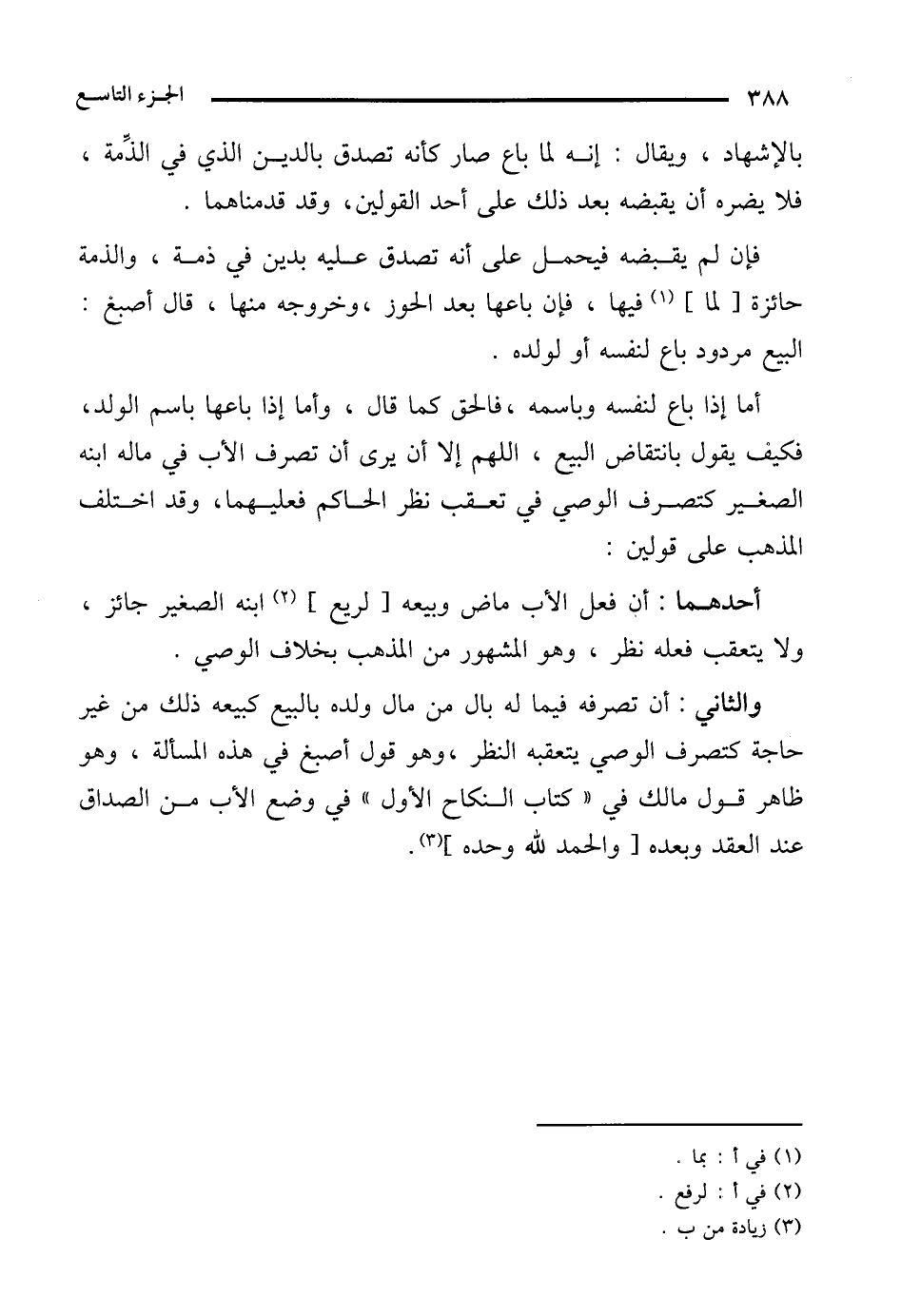 والثاني: أن تصرفه فيما له بال من مال ولده بالبيع كبيعه ذلك من غير حاجة كتصرف الوصي يتعقبه النظر، وهو قول أصبغ في هذه المسألة، وهو ظاهر قول مالك في "كتاب النكاح الأول" في وضع الأب من الصداق عند العقد وبعده [والحمد لله وحده] (¬3).