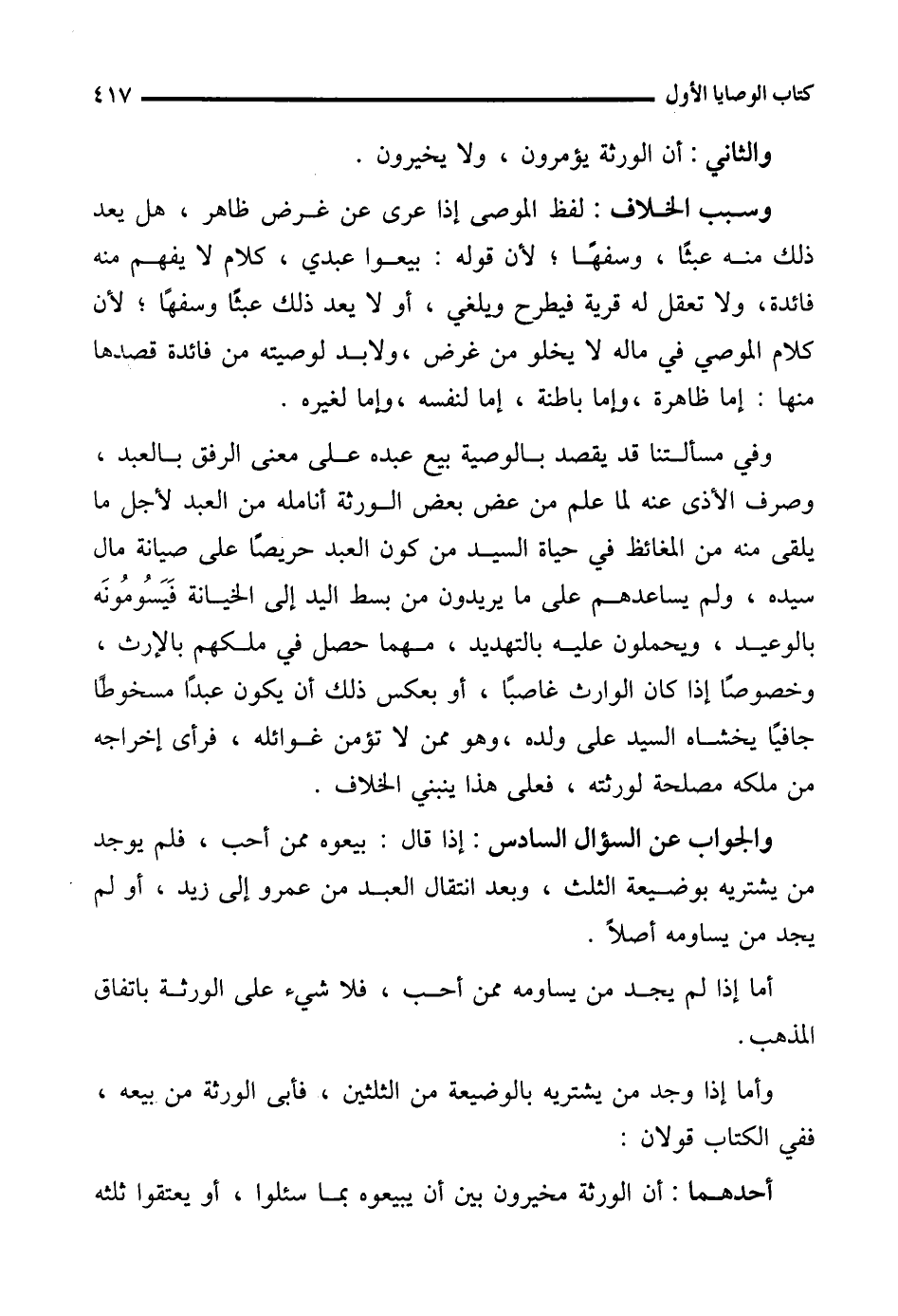 وفي مسألتنا قد يقصد بالوصية بيع عبده على معنى الرفق بالعبد، وصرف الأذى عنه لما علم من عض بعض الورثة أنامله من العبد لأجل ما يلقى منه من المغائظ في حياة السيد من كون العبد حريصًا على صيانة مال سيده، ولم يساعدهم على ما يريدون من بسط اليد إلى الخيانة فَيَسُومُونَه بالوعيد، ويحملون عليه بالتهديد، مهما حصل في ملكهم بالإرث، وخصوصًا إذا كان الوارث غاصبًا، أو بعكس ذلك أن يكون عبدًا مسخوطًا جافيًا يخشاه السيد على ولده، وهو ممن لا تؤمن غوائله، فرأى إخراجه من ملكه مصلحة لورثته، فعلى هذا ينبني الخلاف.