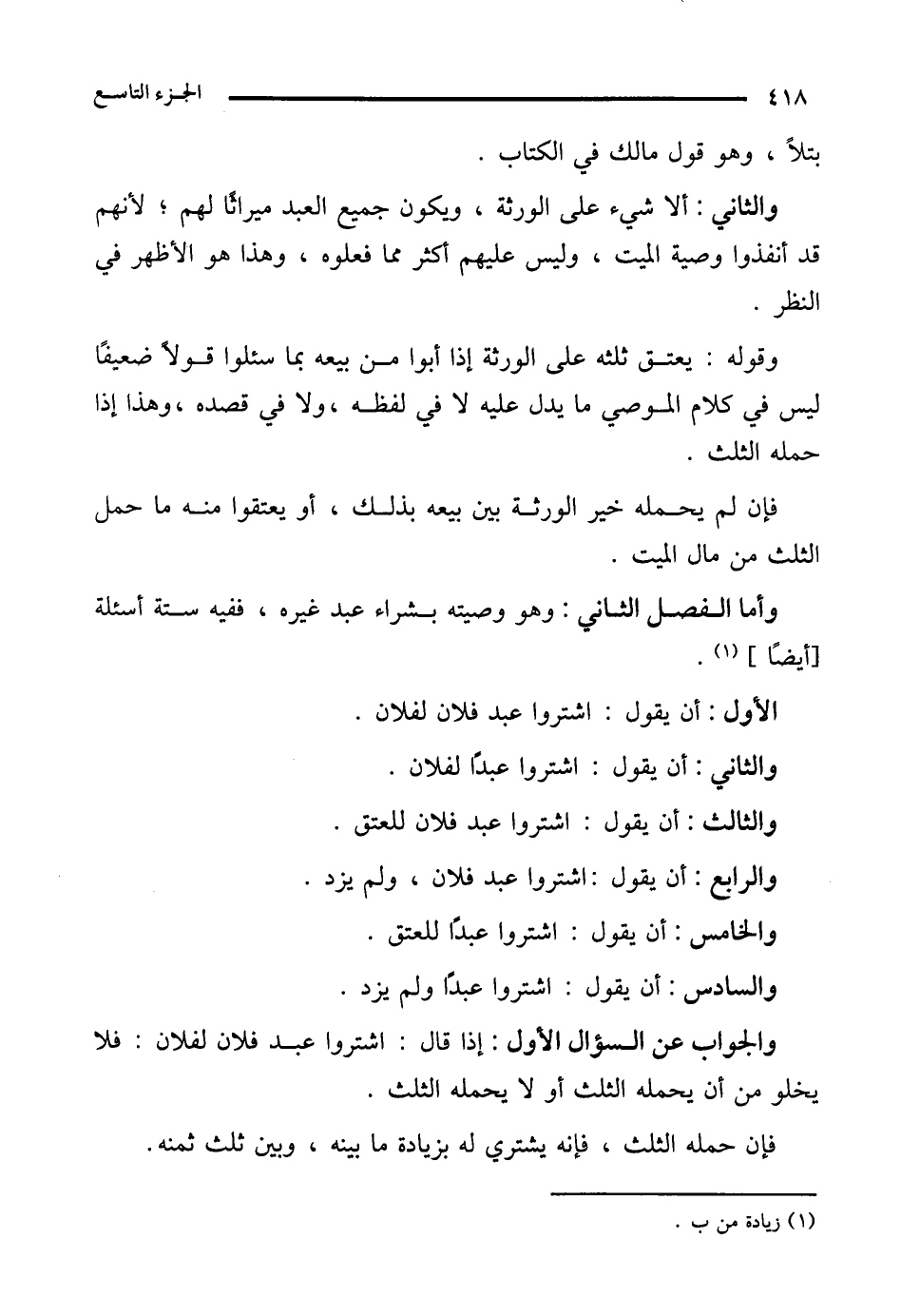 وأما الفصل الثاني: وهو وصيته بشراء عبد غيره، ففيه ستة أسئلة [أيضًا] (¬1).