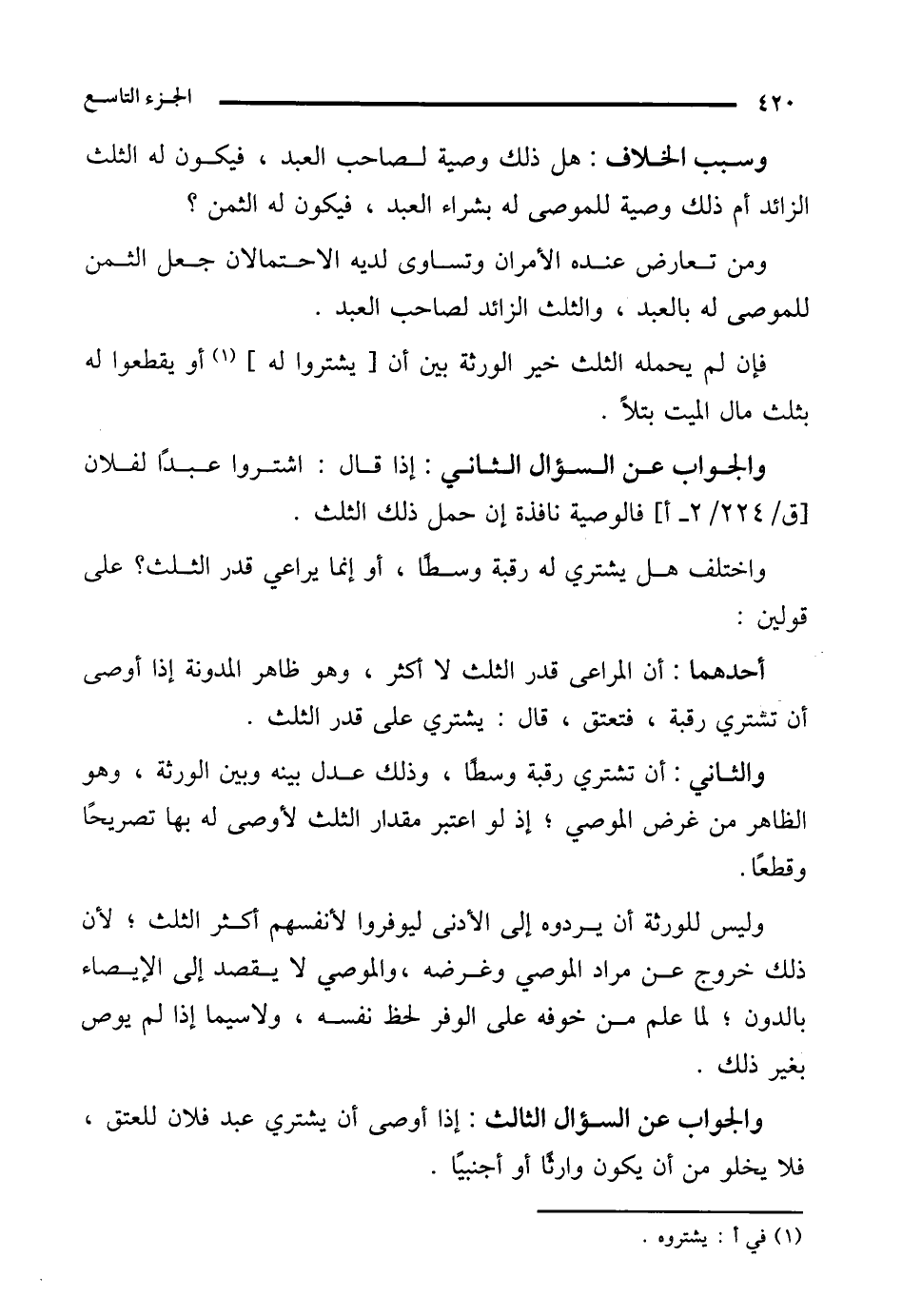 والجواب عن السؤال الثاني: إذا قال: اشتروا عبدًا لفلان فالوصية نافذة إن حمل ذلك الثلث.