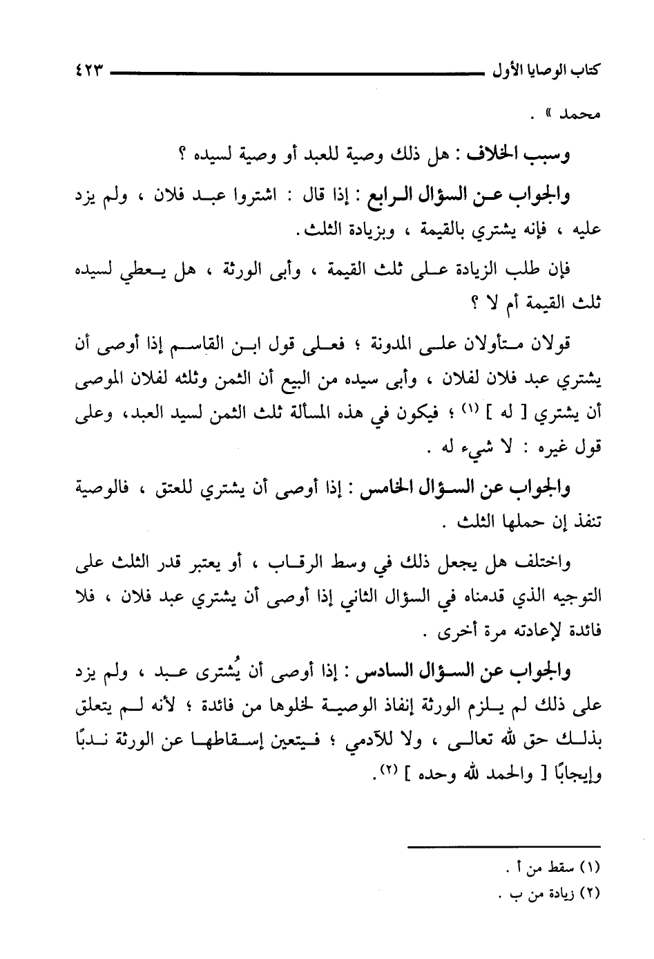 والجواب عن السؤال السادس: إذا أوصى أن يُشترى عبد، ولم يزد على ذلك لم يلزم الورثة إنفاذ الوصية لخلوها من فائدة؛ لأنه لم يتعلق بذلك حق لله تعالى، ولا للآدمي؛ فيتعين إسقاطها عن الورثة ندبًا وإيجابًا [والحمد لله وحده] (¬2).