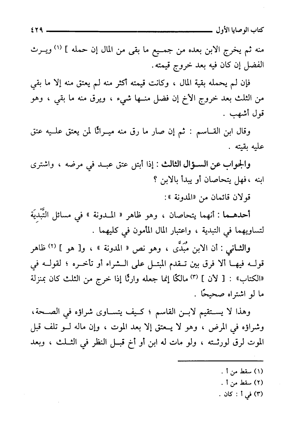 والثاني: أن الابن مُبَدَّى، وهو نص "المدونة"، و [هو] (¬2) ظاهر قوله فيها ألا فرق بين تقدم المبتل على الشراء أو تأخره؛ لقوله في "الكتاب": [لأن] (¬3) مالكًا إنما جعله وارثًا إذا خرج من الثلث كان بمنزلة ما لو اشتراه صحيحًا.