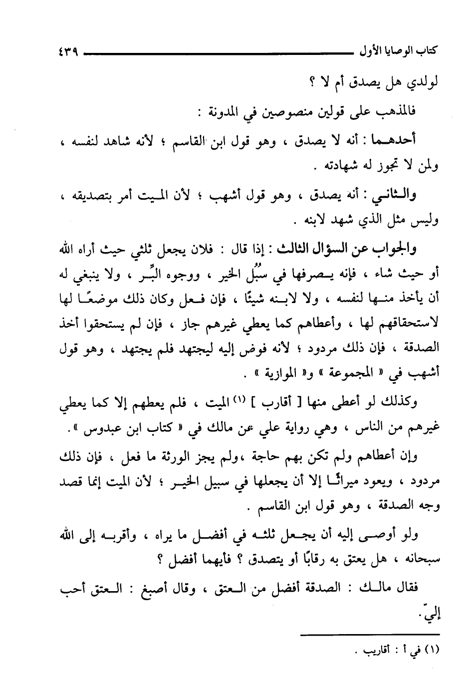 فقال مالك: الصدقة أفضل من العتق، وقال أصبغ: العتق أحب إلىّ.