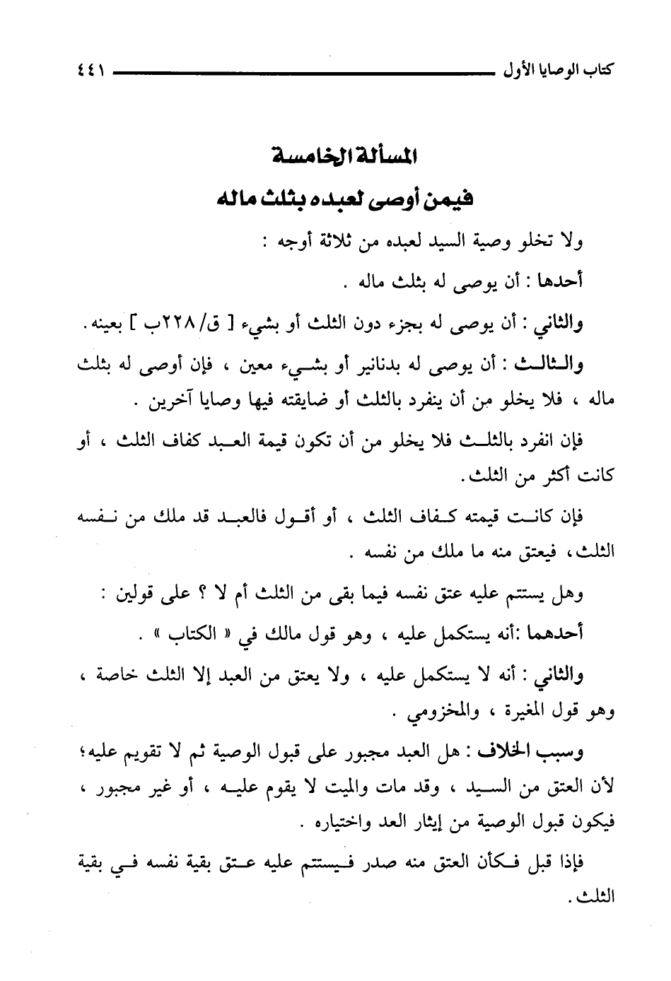 المسألة الخامسة فيمن أوصى لعبده بثلث ماله