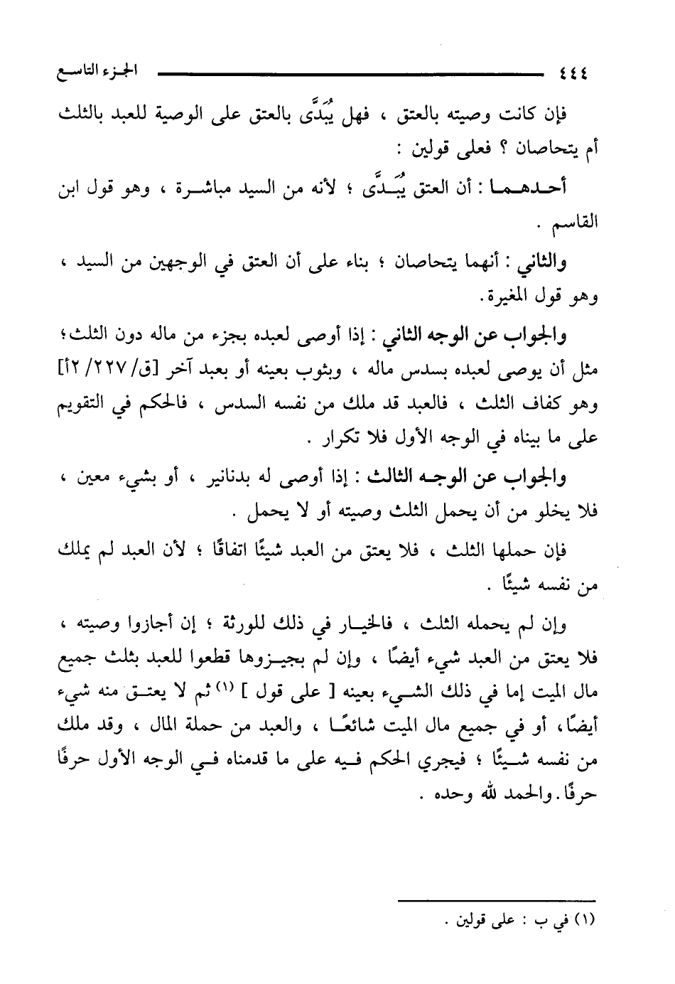 والجواب عن الوجه الثاني: إذا أوصى لعبده بجزء من ماله دون الثلث؛ مثل أن يوصى لعبده بسدس ماله، وبثوب بعينه أو بعبد آخر وهو كفاف الثلث، فالعبد قد ملك من نفسه السدس، فالحكم في التقويم على ما بيناه في الوجه الأول فلا تكرار.