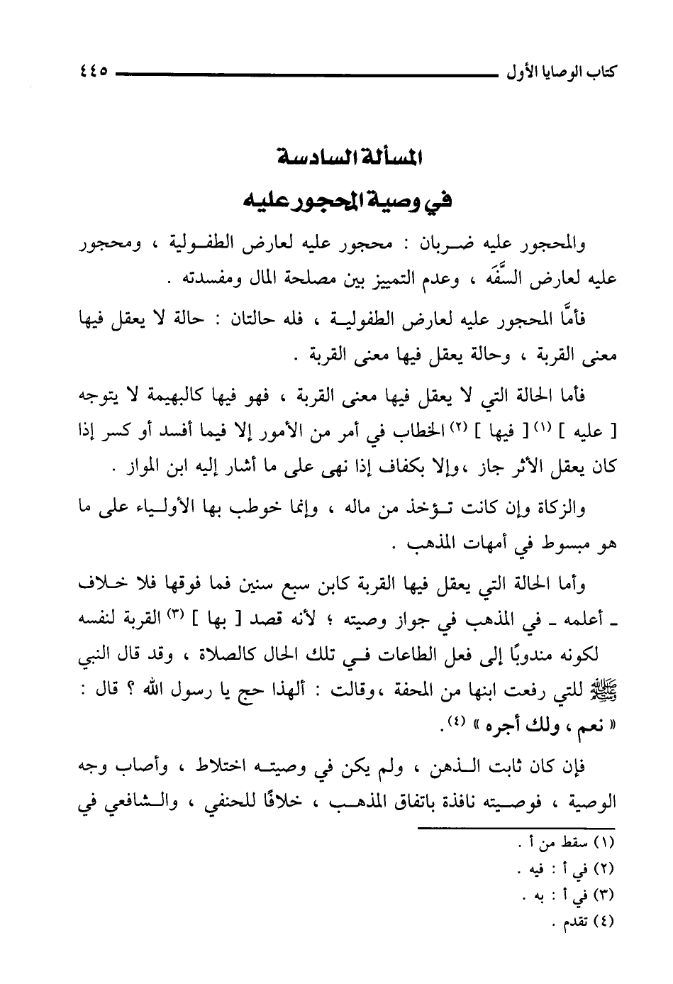 وأما الحالة التي يعقل فيها القربة كابن سبع سنين فما فوقها فلا خلاف -أعلمه- في المذهب في جواز وصيته؛ لأنه قصد [بها] (¬3) القربة لنفسه لكونه مندوبًا إلى فعل الطاعات في تلك الحال كالصلاة، وقد قال النبي - صلى الله عليه وسلم - للتي رفعت ابنها من المحفة، وقالت: ألهذا حج يا رسول الله؟ قال: "نعم، ولك أجره" (¬4).