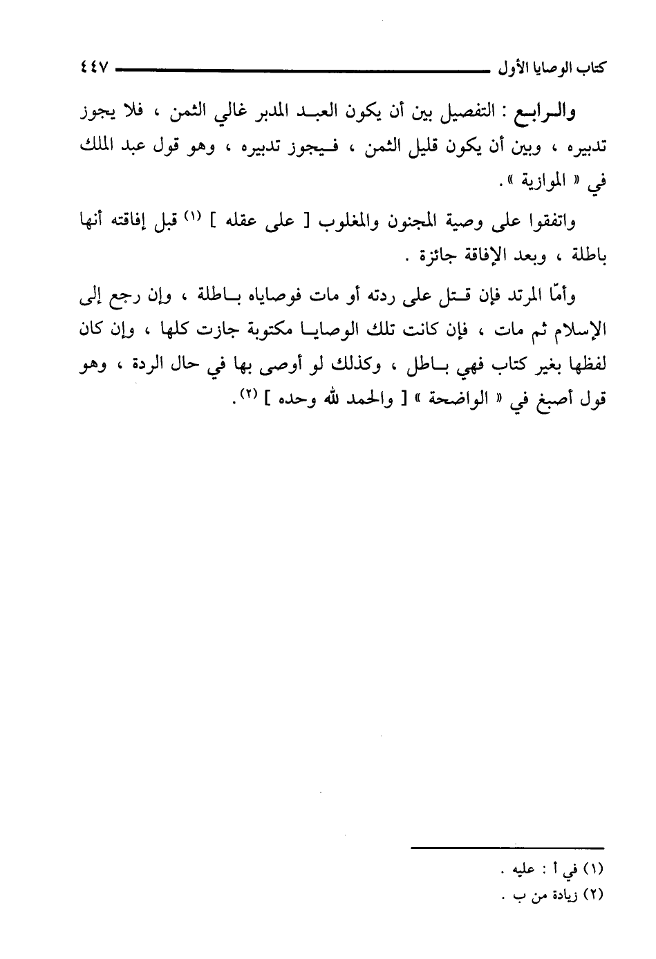 وأما المرتد فإن قتل على ردته أو مات فوصاياه باطلة، وإن رجع إلى الإِسلام ثم مات، فإن كانت تلك الوصايا مكتوبة جازت كلها، وإن كان لفظها بغير كتاب فهي باطل، وكذلك لو أوصى بها في حال الردة، وهو قول أصبغ في "الواضحة" [والحمد لله وحده] (¬2).