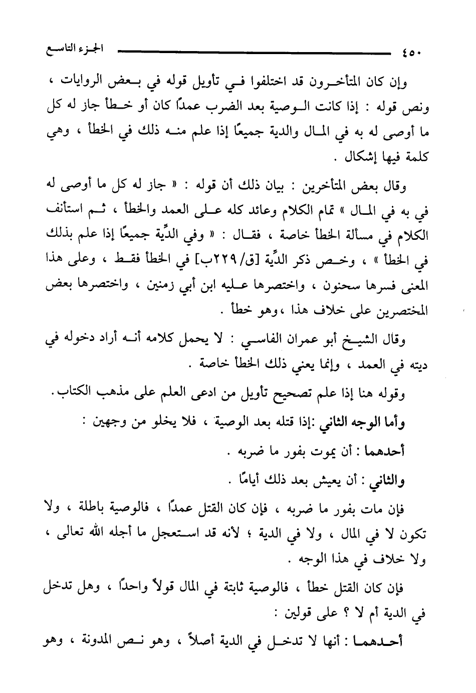 وإن كان المتأخرون قد اختلفوا في تأويل قوله في بعض الروايات، ونص قوله: إذا كانت الوصية بعد الضرب عمدًا كان أو خطأ جاز له كل ما أوصى له به في المال والدية جميعًا إذا علم منه ذلك في الخطأ، وهي كلمة فيها إشكال.