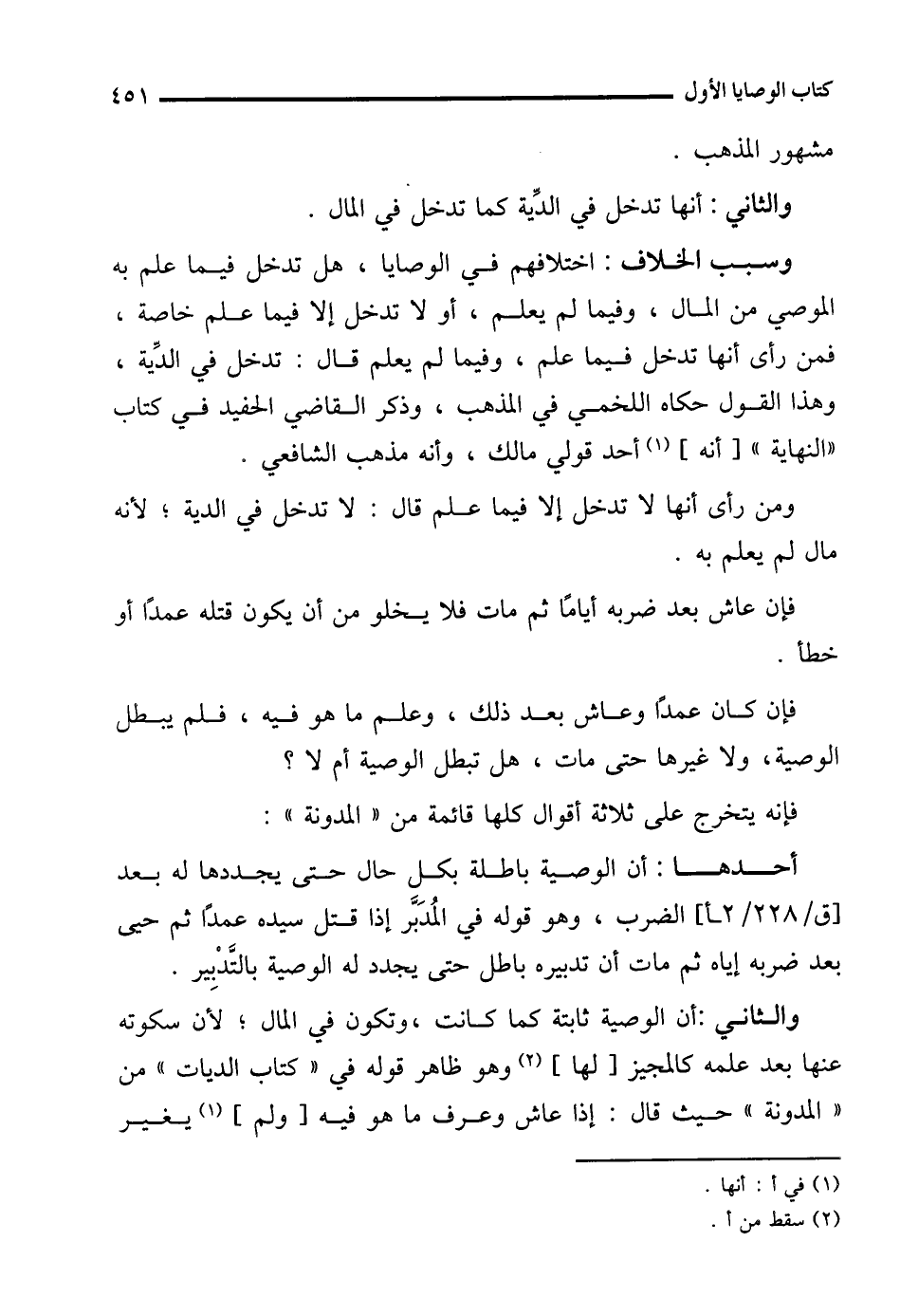 والثاني: أن الوصية ثابتة كما كانت، وتكون في المال؛ لأن سكوته عنها بعد علمه كالمجيز [لها] (¬2) وهو ظاهر قوله في "كتاب الديات" من "المدونة" حيث قال: إذا عاش وعرف ما هو فيه [ولم] (¬3) يغير