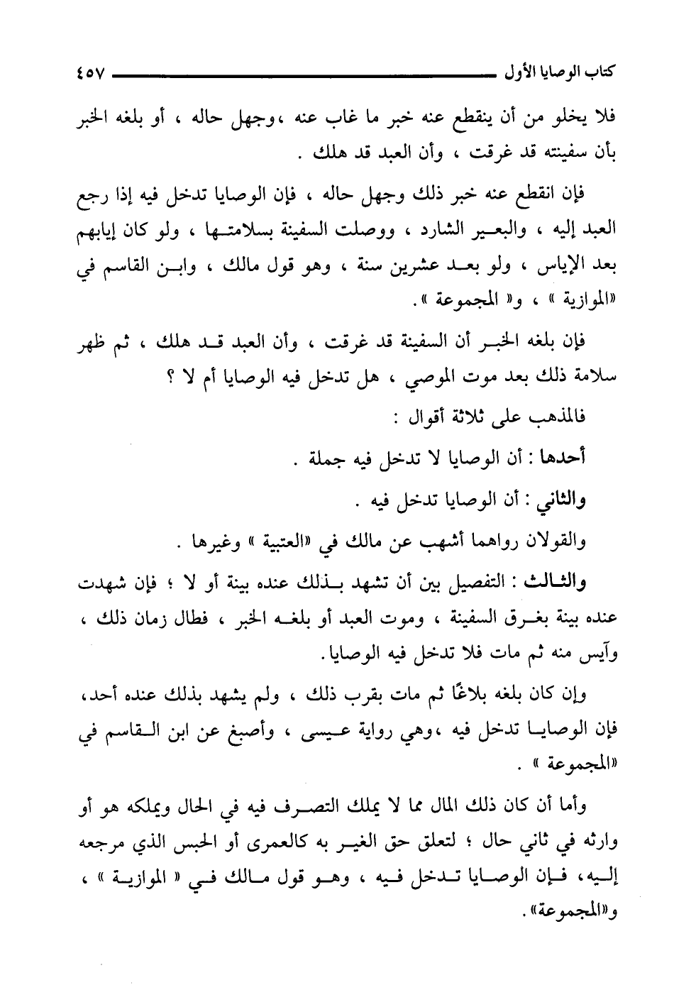 فإن انقطع عنه خبر ذلك وجهل حاله، فإن الوصايا تدخل فيه إذا رجع العبد إليه، والبعير الشارد، ووصلت السفينة بسلامتها، ولو كان إيابهم بعد الإياس، ولو بعد عشرين سنة، وهو قول مالك، وابن القاسم في "الموازية"، و"المجموعة".