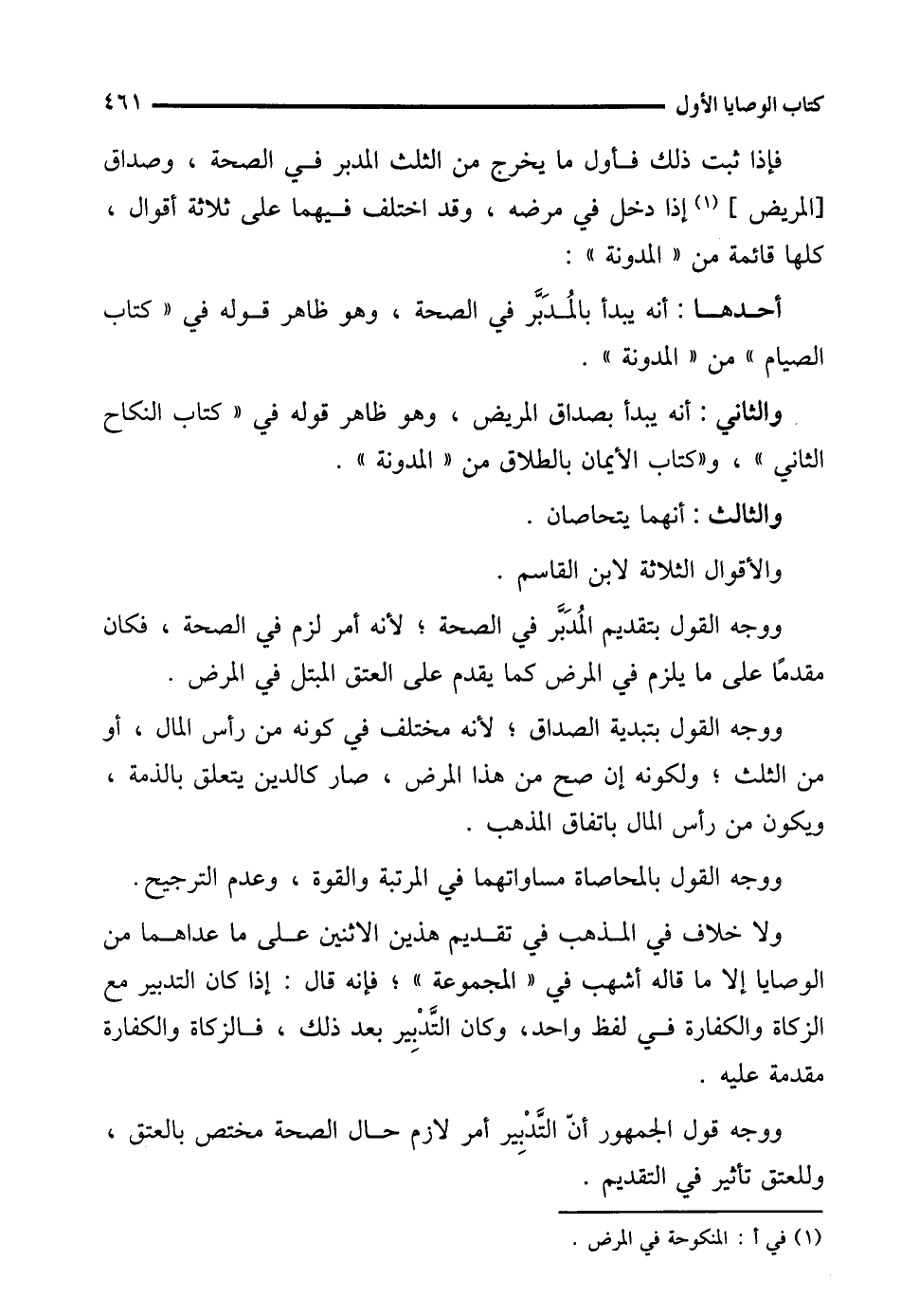 ولا خلاف في المذهب في تقديم هذين الاثنين على ما عداهما من الوصايا إلا ما قاله أشهب في "المجموعة"؛ فإنه قال: إذا كان التدبير مع الزكاة والكفارة في لفظ واحد، وكان التَّدْبِير بعد ذلك، فالزكاة والكفارة مقدمة عليه.