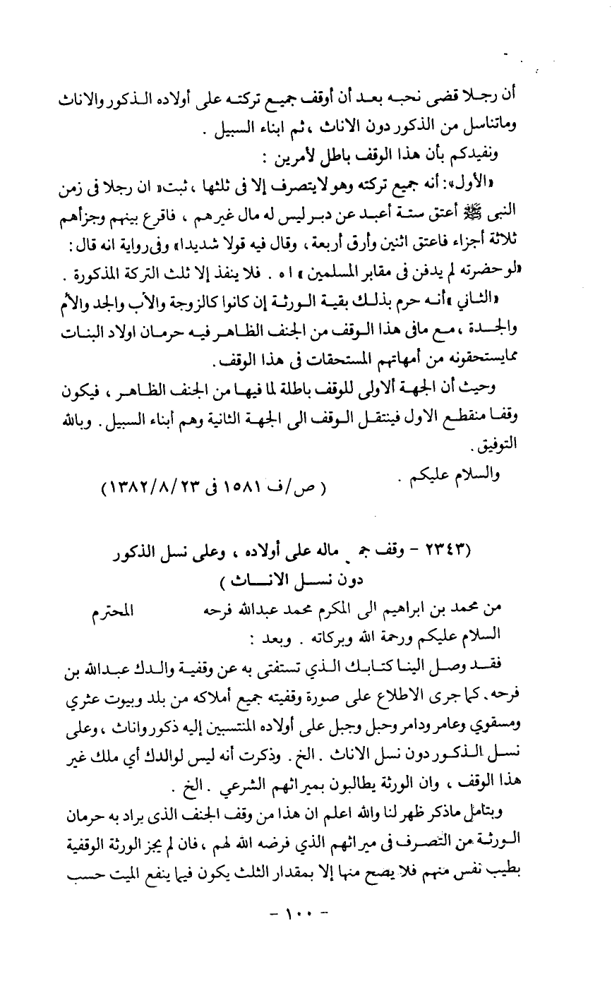 فقد وصل إلينا كتابك الذي تستفتي به عن وقفيةوالدك عبد الله بن فرحة. كما جرى الاطلاع على صورة وقفيته جميع أملاكه من بلد وبيوت عثري ومسقوي وعامر ودامر وحبل وجبل على أولاده المنتسبين إليه ذكور واناث، وعلى نسل الذكور دون نسل الاناث.. الخ. وذكرت أنه ليس لوالدك أي ملك غير هذا الوقف، وأن الورثة يطالبون بميراثهم الشرعي.. الخ.
