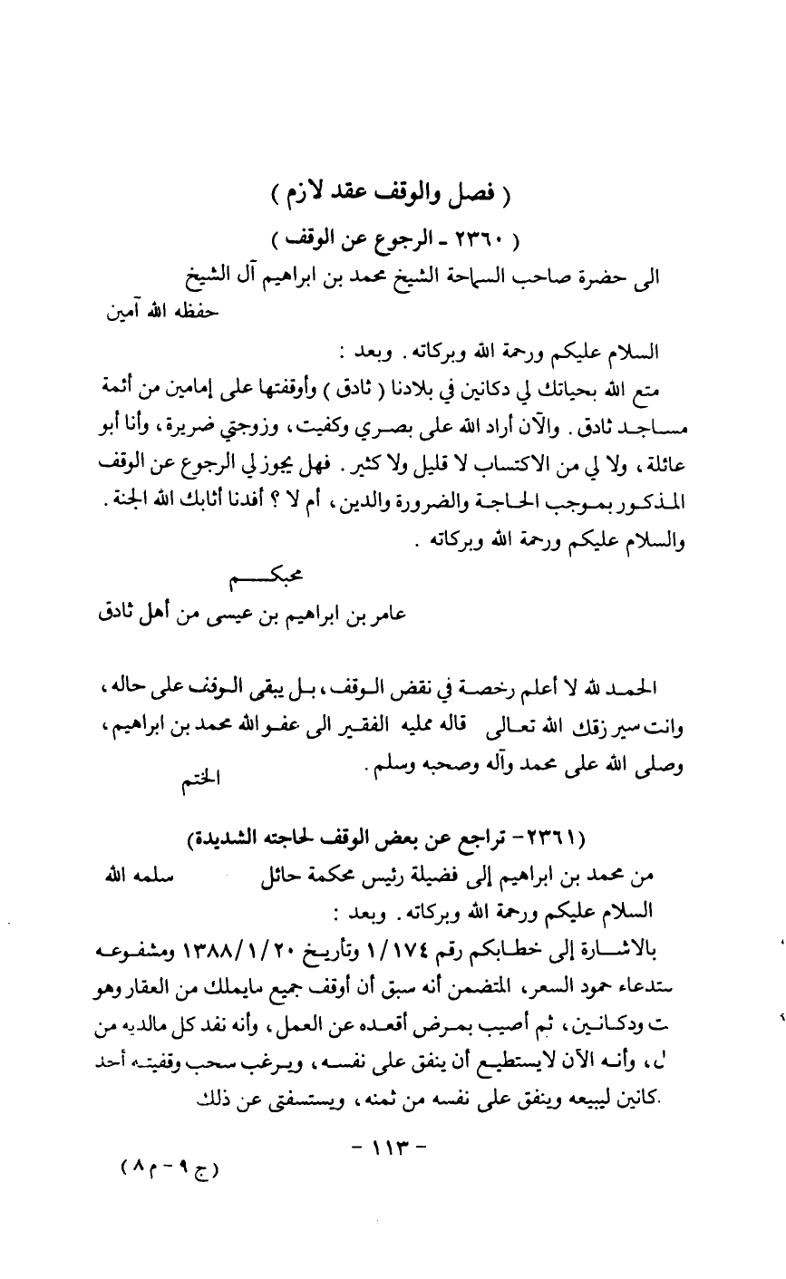 بالاشارة إلى خطابكم رقم 174 /1 وتاريخ 20/1/ 1388 ومشفوعه ستدعاء حمود السعر، المتضمن أنه سبق أن أوقف جميع مايملك من العقار وهو ودكاكين، ثم أصيب بمرض أقعده عن العلم، وأن نفد كل مالديه من، وأنه الآن لا يستطيع أن ينفق على نفسه، ويرغب سحب وقيته أحد كانين ليبيعه وينفق على نفسه من ثمنه، ويستسفتي عن ذلك.