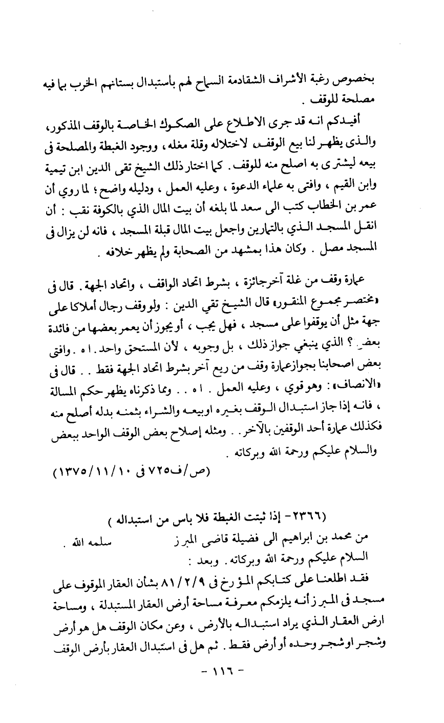فقد اطلعنا على كتابكم المؤرخ في 9/2/ 81 بشأن العقار الموقوف على مسجد في المبرز أنه يلزمكم معرفة مساحة أرض العقار المستبدلة، ومساحة أرض العقار الذي يراد استبداله بالأرض، وعن مكان الوقف هل هو أرض وشجر أو شجر وحده أو أرض فقط. ثم هل في استبدال العقار بأرض الوقف