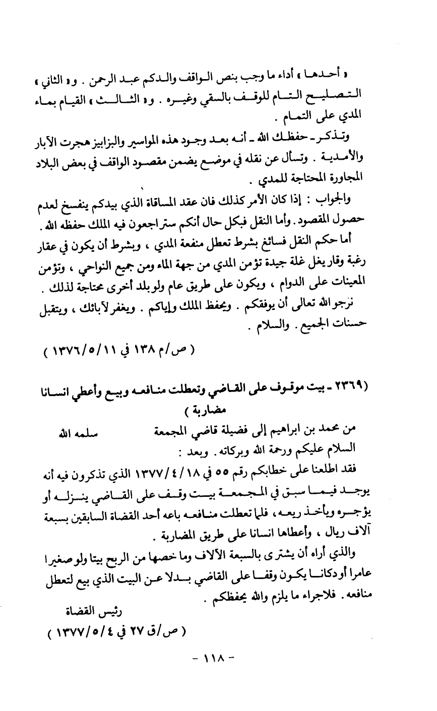 فقد أطلعنا على خطابكم رقم 55 في 18/4/ 1377هـ الذي تذكرون فيه أنه يوجد فيما سبق في المجمعة بيت وقف على القاضي ينزله أو يؤجره ويأخذ ريعه، فلما تعطلت منافعة بأعه أحد القضاة السابقين بسبعة آلاف ريال، وأعطاهاانسانا على طريق المضاربة.