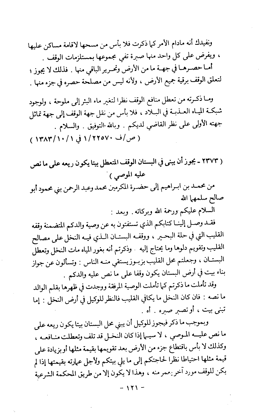 ويموجب ماذكر فيجوز للوكيل أن يبني محل البستان بيتا يكون ريعه على مانص عليه الموصي، لاسيما إذا كان النخل قد تلف وتعطلت منافعه، وكذلك لابأس باقتطاع جزء من الأرض بعد تقويمها بقيمة مثلها أو بزيادة ع لى قيمةمثلها احتياطا نظرا لحاجتكم إلىمايلي بيتكم ولأجل عمارته بقيمتها إذا لم يكن للوقف مورد آخر يعمر منه، وهذا لايكون إلا من طريق المحكمة الشرعية،