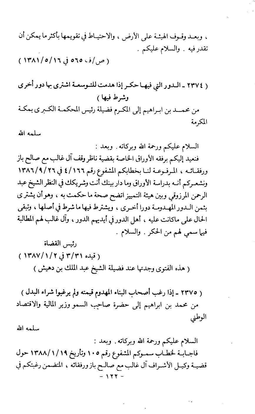 فنعيد إليكم برفقة الأوراق الخاصة بقضية ناظر وقف آل غالب مع صالح باز ورفقائه، المرفوعة لنا بخطابكم المشفوع رقم 166 / 4 في 26/9/ 1386 ونشعركم أنه بدراسة الأوراق وما دار بينك أنت وشريكك في النظر الشيخ عبد الرحمن المرزوقي وبين هيئة التمييز اتضح صحة ماحكمت به، وهو أن يشتري بثمن الدور المهدومة دوراً أخرى، ويشترط فيها ماشرط في أصلها، وتبقى الحال على ماكانت عليه، أهل الدور في أيديهم الدور، وآل غالب لهم المطالبة فيما سمي لهم من الحكر. والسلام.