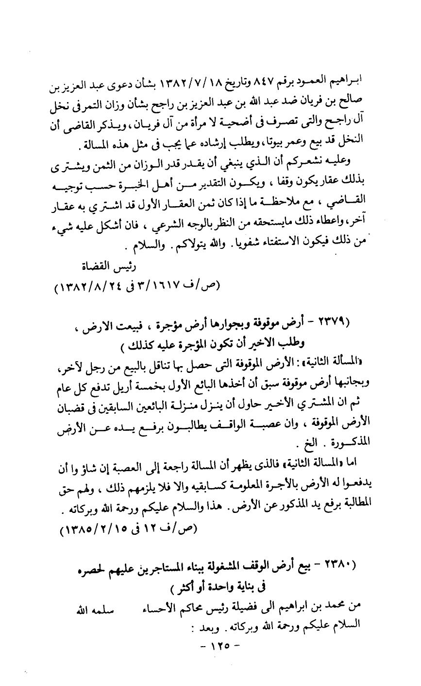 ابراهيم العمود برقم 847 وتاريخ 18/7/ 1382 بشأن دعوى عبد العزيز بن صالح بن فريان ضد عبد الله بن عبد العزي بن راجح بشأن وزان التمر في نخل آل راجح والتي تصرف في أضحية لامرأة من آل فريان، ويذكر القاضي أن النخل قد بيع وعمر بيوتا، ويطلب إرشاده عما يجب في مثل هذه المسألة.