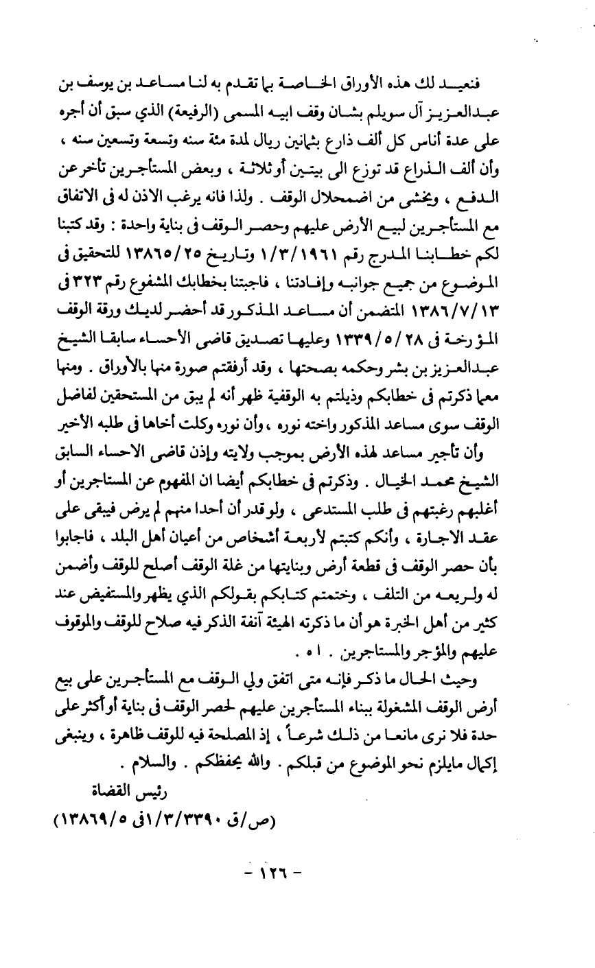 فنعيد لك هذه الأوراق الخاصة بما تقدم به لنا مساعد بن يوسف بن عبد العزيز آل سويلم بشأن وقف ابيه المسمى (الرفيعة) الذي سبق أن أجره على عدة أناس كل ألف ذارع بثمانين ريال لمدة مئة سنة وتسعة سننه، وأن ألف الذراع قد توزع إلى بيتين أو ثلاثة، وبعض المستأجرين تأخر عن الدفع، ويخشى من أضمحلال الوقف. ولذا فإنه يرغب الاذن في الاتفاق مع المستأجرين لبيع الأرض عليهم وحصر الوقف في بناية واحدة: وقد كتبنا لكم خطابنا المدرج رقم 1961/3/ 1 وتاريخ 25/13865 للتحقيق في الموضوع من جميع جوانبه وإفادتنا، فأجبنتنا بخطابك المشفوع رقم 323 في 13/7/ 1386 المتضمن أن مساعد المذكور قد أحضر لديك ورقة الوقف المؤرخة في 28/5/ 1339 وعليها تصديق قاضي الأحساء سابقا الشيخ عبد العزيز بن بشر وحكمه بصحتها، وقد أرفقتم صورة منها بالأوراق. ومنها معما ذكرتم في خطابكم وذيلتم به الوقفية ظهر أنه لم يبق من المستحقين لفاضل الوقف سوى مساعد المذكور وأخته نوره، وأن نوره وكلت أخاها في طلبه الأخير وأن تأخير مساعد لهذه الأرض بموجب ولايته وإذن قاضي الاحساء السابق الشيخ محمد الخيال. وذكرتم في خطابكم أيضاً أن المفهوم عن المستأجرين أو أغلبهم رغبتهم في طلب المستدعي، ولو قدر أن أحدا منهم لم يرض فيبقى على عقد الاجارة، وأنكم كتبتم لأربعة أشخاص من أعيان أهل البلد، فأجابوا بأن حصر الوقف في قطعة أرض وينايتها من غلة الوقف أصلح للوقف وأضمن له ولريعه من التلف، وختمتم كتابكم بقولكم الذي يظهر والمستفيض عند كثير من أهل الخبرة هو أن ماذكرته الهيئة آنفة الذكر فيه صلاح للوقف والموقوف عليهم والمؤجر والمستاجرين. اهـ.