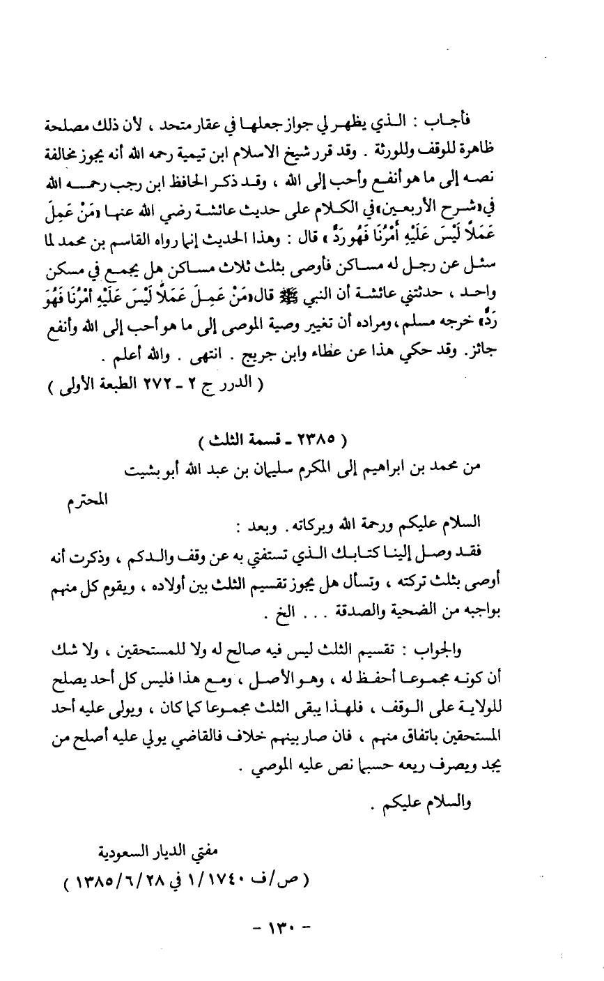 فأجاب: الذي يظهر لي جواز جعلها في عقار متحد، لأن ذلك مصلحة ظاهرة للوقف وللورثة. وقد قرر الاسلام ابن تيمية رحمه الله أن يجوز مخالفة نصه إلى ماهو أنفع وأحب إلى الله، وقد ذكر الحافظ ابن رجب رحمه الله في "شرح الأربعين " في الكلام على حديث عائشة رضي الله عنها " من عمل عملا ليس عليه أمرنا فهو رد " قال: وهذا الحديث إنما رواه القاسم بن محمد لما سئل عن رجل له مساكن فأوصى بثلث ثلاث مساكن هل يجمع في مسكن واحد، حدثتني عائشة أن النبي صلى الله عليه وسلم قال: " من عمل عملاً فليس عليه أمرنا فهو رد " خرجه مسلم، ومراده أن تغيير وصية الموصى إلى ماهو أحب إلى الله وأنفع جائز. وقد حكي هذا عن عطاء وابن جريج. انتهى. والله أعلم.
