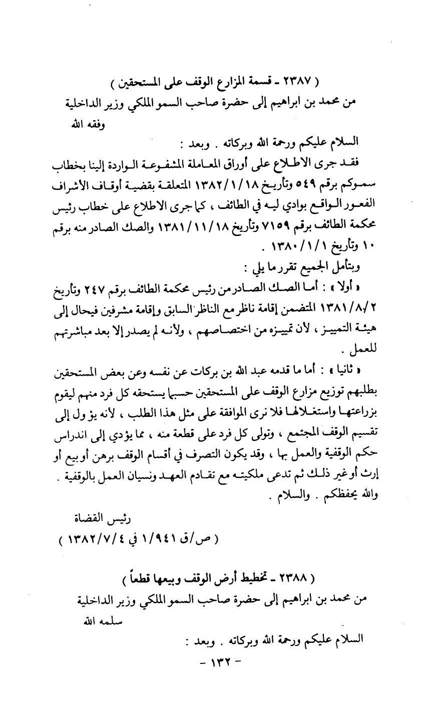 ثانياً: أما ماقدمه عبد الله بن بركات عن نفسه وعن بعض المستحقين بطلبهم توزيع مزارع الوقف على المستحقين حسبما يستحقه كل فرد منهم ليقوم بزراعتها واستغلالها فلا نرى الموافقة على مثل هذا الطلب، لأنه يؤول إلى تقسيم الوقف المجتمع، وتولى كل فرد على قطعة منه، مما يؤدي إلى اندراس حكم الوقفية والعمل بها، وقد يكون التصرف في أقسام الوقف برهن أو بيع أو إرث أو غير ذلك ثم تدعى ملكيته مع تقادم العهد ونسيان العمل بالوقفية.