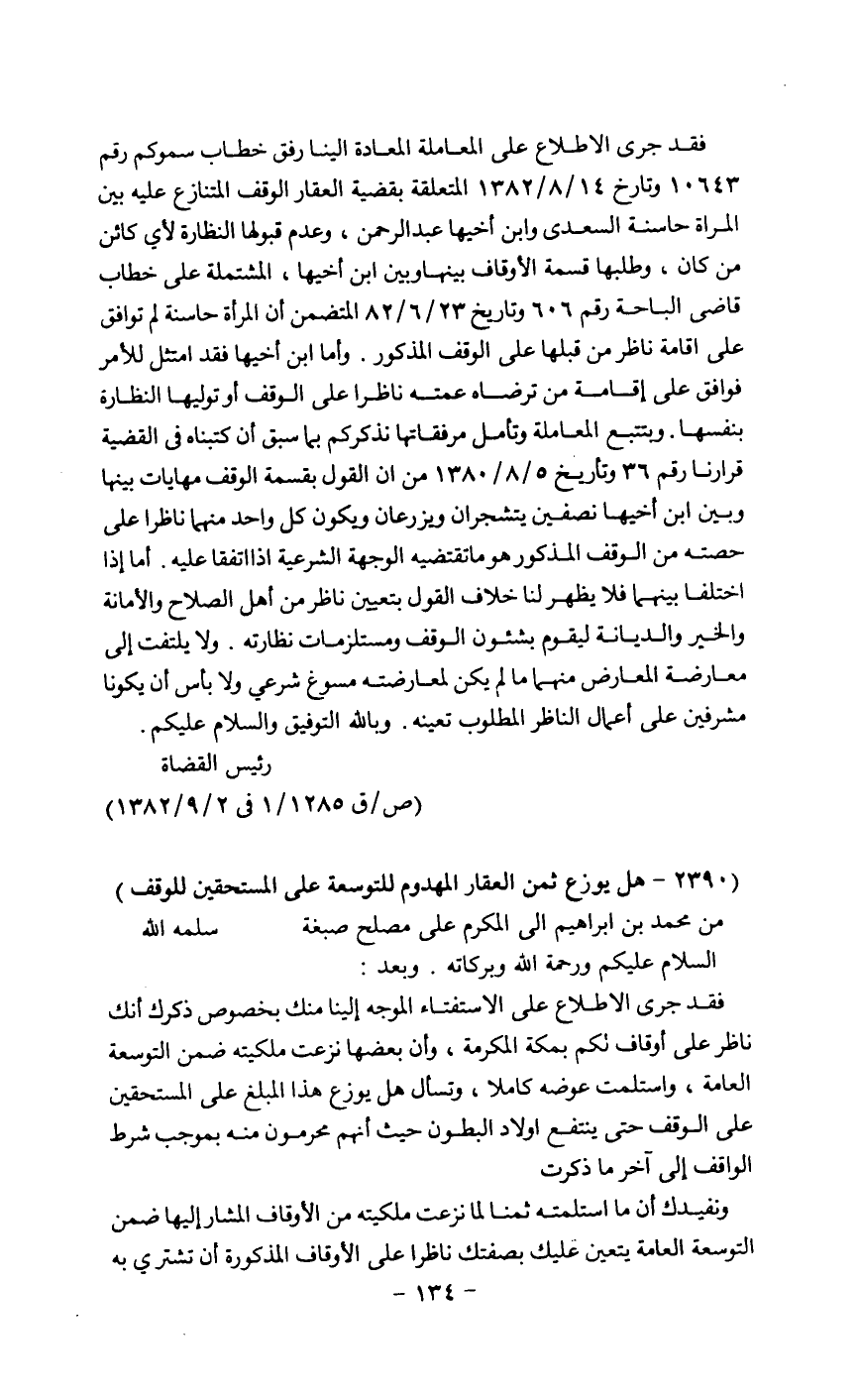 فقد جرى الاطلاع علىالمعاملة المعادة إلينا رفق خطاب سموكم رقم 10643 وتاريخ 14/8/ 1382 المتعلقة بقضية العقار الوقف المتنازع عليه بين المرأة حاسنة السعدي وابن أخيها عبد الرحمن، وعدم قبولها النظارة لأي كائن، وطلبها قسمة الأوقاف بينها وبين ابن أخيها، المشتملة على خطاب قاضي الباحة رقم 606 وتاريخ 23/6/ 82 المتضمن أن المرأة حاسنة لم توافق على اقامة ناظر من قبلها على الوقف المذكور. وأما ابن أخيها فقد امتثل للأمر فوافق علىإقامة من ترضاه عمته ناظرا على الوقف أو توليها النظارة بنفسها. ويتتبع المعاملة وتأمل مرفقاتها نذكركم بما سبق أن كتبناه في القضية قرارنا رقم 36 وتاريخ 5/8/ 1380 من ان القول بقسمة الوقف مهايات بينها وبينابن أخيها نصفين يتشجران ويزرعان ويكون كل واحد منهما ناظرا على حصته من الوقف المذكور هو ماتقتضيه الوجهة الشرعية إذا اتفقا عليه. أما إذا اختلفا بينهما فلا يظهر لنا خلاف القول بتعيين ناظر من أهل الصلاح والأمانة والخير والديانة ليقوم بشئون الوقف ومستلزمات نظارته. ولايلتف إلى معارضة المعارض منهما مالم يكن لمعارضته مسوغ شرعي ولابأس أن يكونا مشرفين على أعمال الناظر المطلوب تعينه. وبالله التوفيق والسلام عليكم.