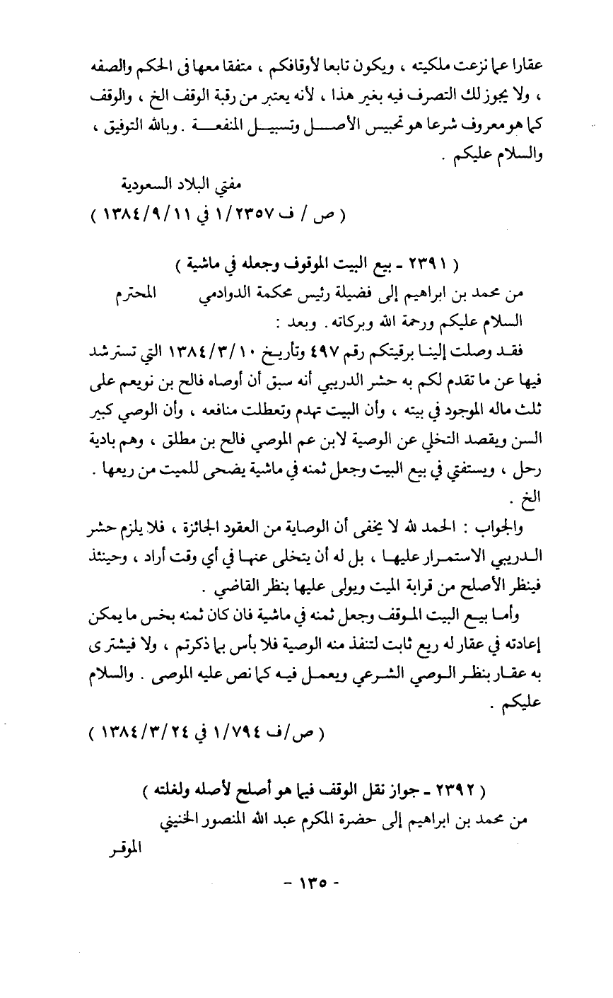 فقد وصلت إلينا برقيتكم رقم 497 وتاريخ 10/3/ 1384هـ التي تسترشد فيها عن ماتقدم لكم به حشر الدريبي أنه سبق أن أوصاه فالح بن نويعم على ثلث ماله الموجود في بيته، وأن البيت تهدم وتعطلت منافعه، وأن الوصي كبير السن ويقصد التخلي عن الوصية لابن عم الموصي فالح بن مطلق، وهم بادية رحل، ويستفتي في بيع البيت وجعل ثمنه في ماشية يضحى للميت من ريعها.. الخ.