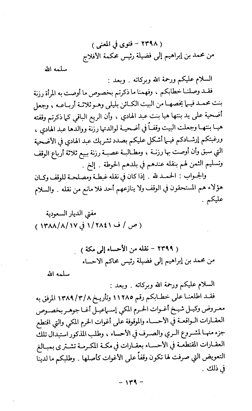 فقد وصلنا خطابكم، وفهمنا ماذكرتم بخصوص ما أوصت به المرأة رزنة بنت محمد فيما يخصها من البيت الكائن بليلى وهو ثلاثة أرباعه، وجعل أضحية على يد بنتها هيا بنت عبد الهادي، وأن الريع الباقي كما ذكرتم وقفته هيا بنتها وجعلت البيت وقفاً في أضحية لوالدتها رزنة ووالدها عبد الهادي، ورغبتكم إرشادكم فيهما أشكل عليكم بصدد تشريك عبد الهادي في الأضحية التي سبق وأن أوصت بها رزنة، ومطالبة عصبة رزنة ببيع ثلاثة أرباع الوقف وتسليم الثمن لهم بنقله عندهم في بلدهم الحوطة.. الخ.